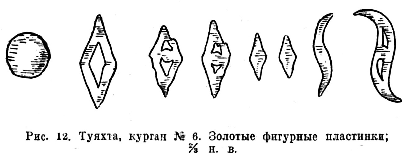Основательнее всех ограблен сруб в Туяхтинском кургане. Сильно разрушившиеся обломки костей человека, встречавшиеся на разных глубинах в грабительском ходе, в камере отсутствовали совершенно. Здесь найдено лишь несколько кусочков истлевшего дерева со следами окиси меди и бесформенными измятыми мелкими листочками золота. Среди них найден также обрывок тонкой кожи со следами окиси меди и с узелком из скрученных сухожилий, повидимому — обрывок одежды.