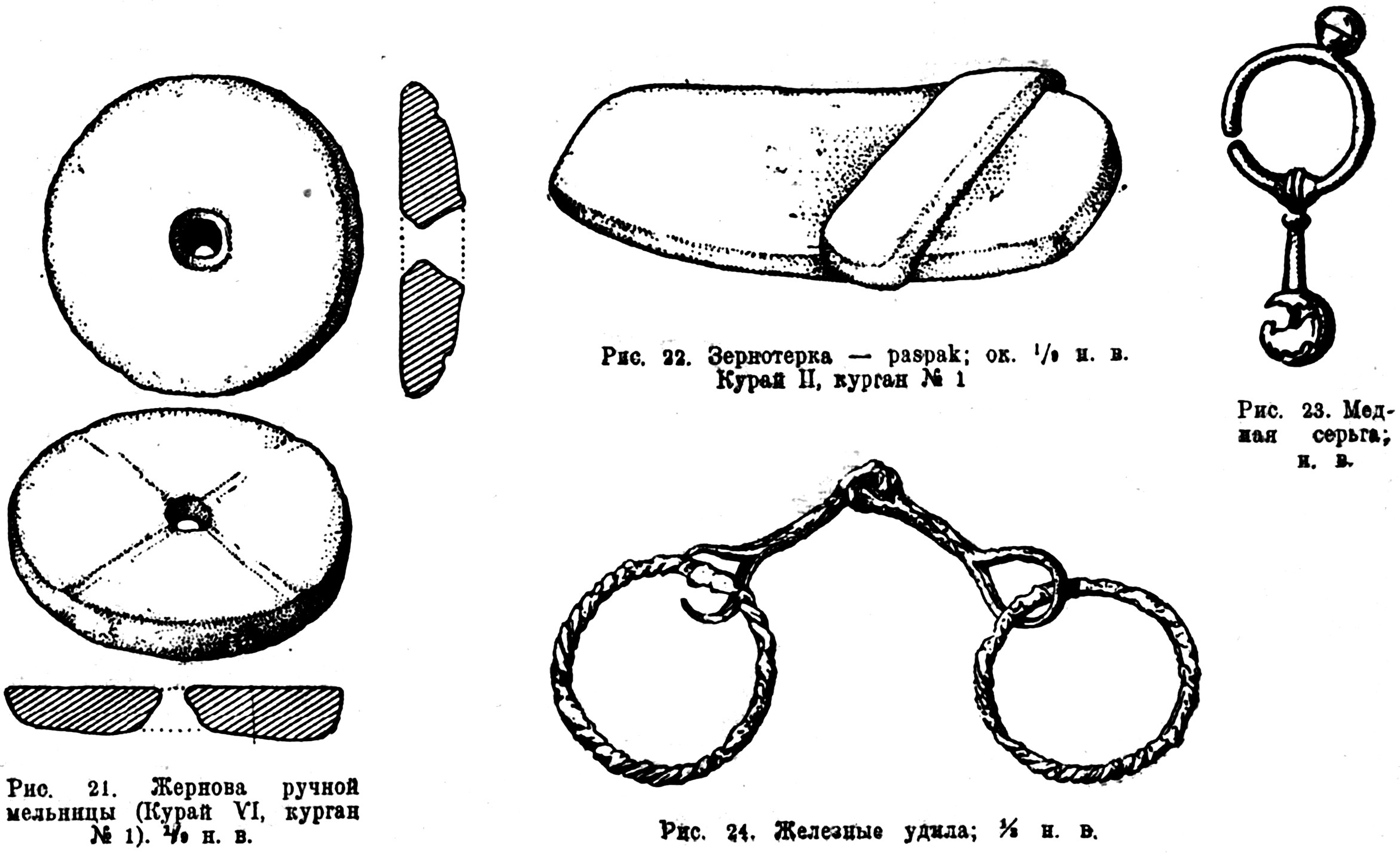 Другой соседний курган содержал двуконное ограбленное погребение, давшее, однако, ряд интересных вещей — костяные, втульчатые, четырёхгранные стрелы (рис. 62), железное долото в роговой рукоятке (рис. 63) и костяную пряжку (рис. 64).