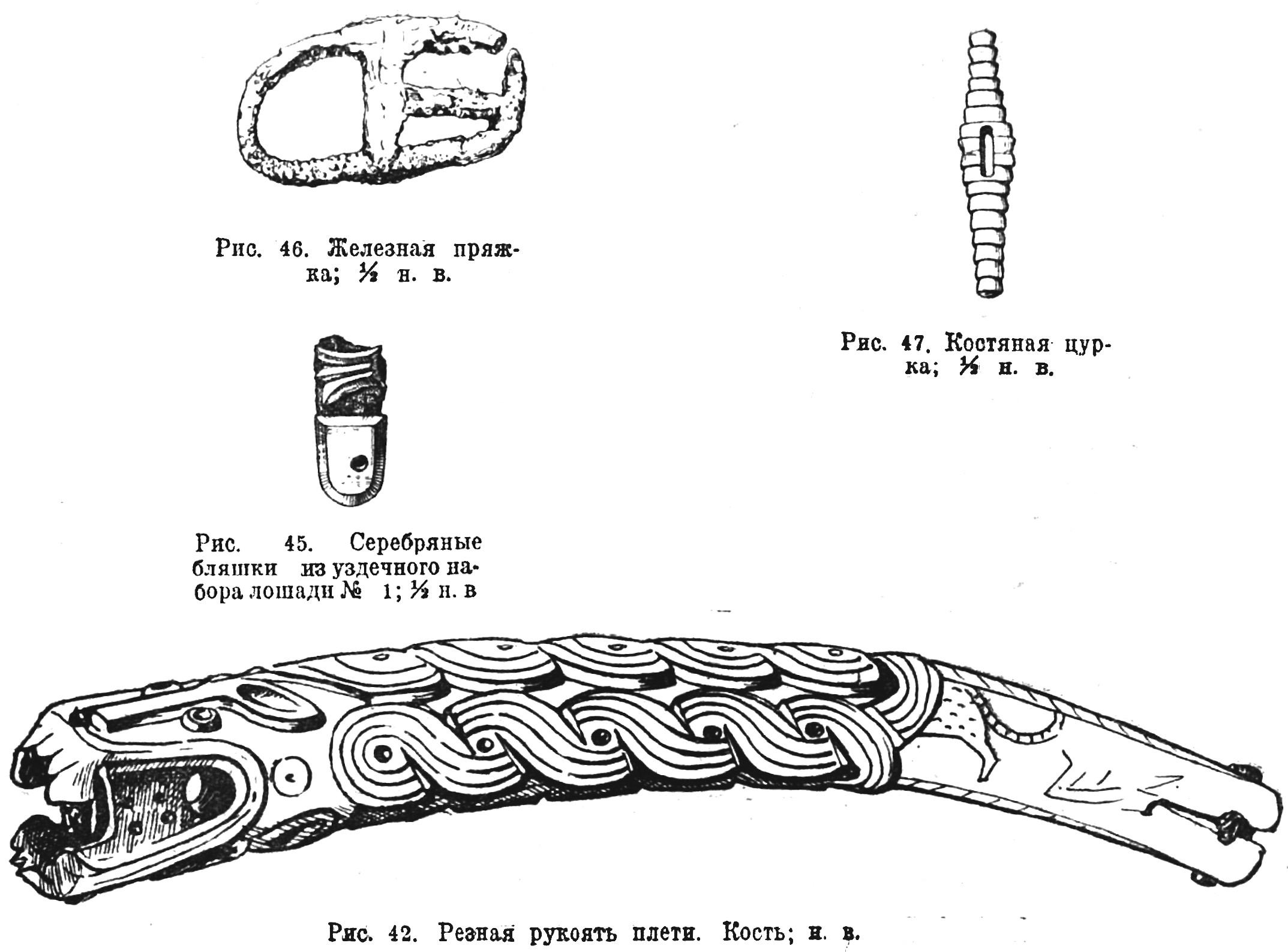 Здесь извлечены последовательно: 25 серебряных массивных бляшек в виде розеток, 3 ременных наконечника (рис. 41), железное кольцо, 4 железных наременных бляшки, железная пряжка, 8 железных колец целых и сломанных с прикреплёнными к ним двумя и тремя железными же обоймами, 2 железные пряжки и обломок третьей, 2 кольчатые железные обоймы, железная подковообразная петля и обломок другой, удила железные двусоставные со вторым вращающимся кольцом и обоймой для чумбура. Сбоку кувшинчика, во всю толщу груды вещей втулкой вверх вертикально торчала костяная резная рукоятка (рис. 42). Среди блях узды были также найдены деревянные обмотанные берёстой (лыком) ножны ножа и железный стержень в деревянной рукоятке со следами красной краски (остатки вилки?).