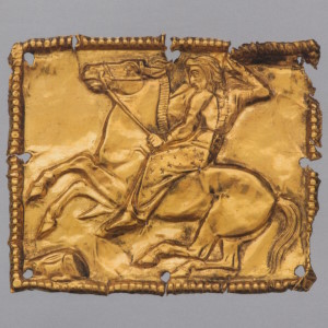 Бляшка нашивная в виде фигурки конного скифа. ^
