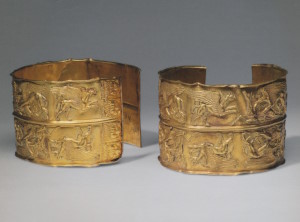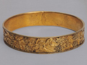 Боспор. Браслет — первая половина IV в. до н.э.; рельефы — вторая четверть V в. до н.э. Золото. Диаметр 10,1 см. Окрестности Керчи. Курган Куль-Оба. Мужское погребение. Раскопки в 1830 г. Инв. №КО.18.