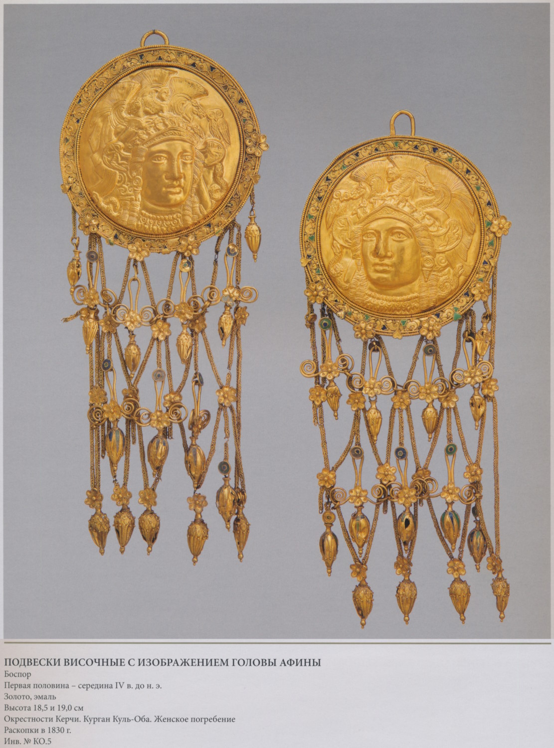 Пара подвесок с дисками, на которых помещено изображение Афины в шлеме. Рельеф воспроизводит голову статуи Афины Девы, созданной из золота и слоновой кости Фидием для Парфенона в 40-е гг. V в. до н.э. Подвески, по-видимому, самое раннее повторение знаменитой статуи. Головы изображены в трёхчетвертном повороте в противоположных направлениях для правой и левой подвесок. Черты лица трактованы несколько обобщённо, что создаёт впечатление монументальности, при этом тщательно переданы детали шлема: фигуры сфинкса и пегасов на гребнях, головы грифонов и оленей на налобнике, оперение спутницы Афины совы, чешуя змей. В подробно проработанных серьгах и ожерелье воспроизведены реальные украшения, подобные, например, серьгам с коническими подвесками, найденным в кургане Карагодеуашх (с. 216), и ожерелью из Большой Близницы (с. 170). Традиционно считается, что рельефы медальонов оттиснуты по металлическим матрицам (Kieseritzky 1883. S. 293; Онайко 1979. С. 266), однако Р.С. Минасян, сравнивая данные подвески со сходными из кургана Большая Близница (с. 164), (136/137) выяснил, что рельефы на них были изготовлены с использованием деревянных матриц, по-видимому, в одной мастерской теми же мастерами (Минасян 1999. С. 39).
