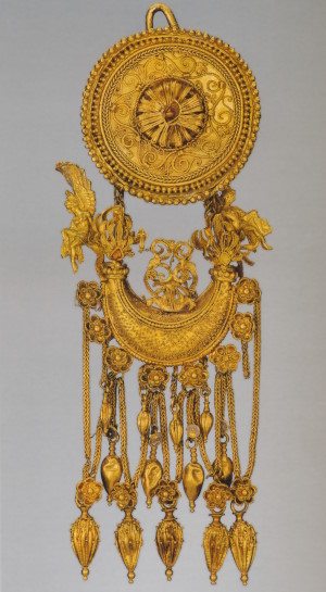 Подвешенные к диску цепочки на розетках образуют сеть, которую как бы растягивают двойные спирали и в ячейках которой размещены рядами подвески, напоминающие по форме зёрна и бутоны. В декоре подвесок, листков плюща и миниатюрных дисков на цепочках использована эмаль тёмно-синего и зелёного цветов. Ещё в древности сеть из цепочек подвергалась капитальной починке, в результате которой часть утраченных деталей была заменена петлями со спиралями. Эти петли, стилистически чуждые подвескам, всё же входили в репертуар орнаментальных мотивов золотых украшений, напоминая сходный элемент филигранного узора в других изделиях (с. 97, 144).