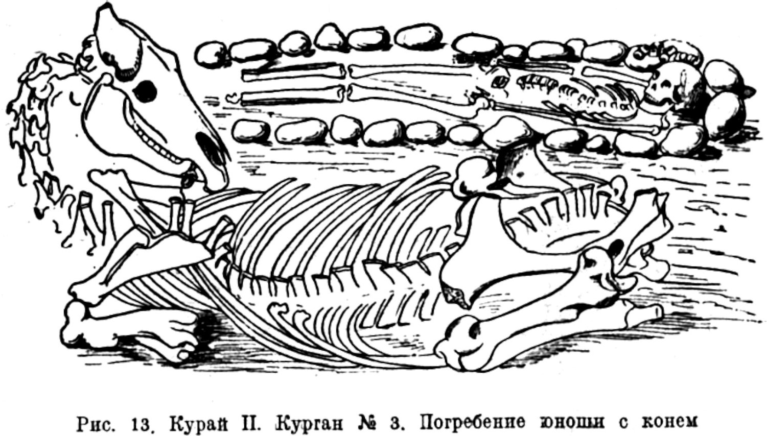 Вторая лошадь, повидимому, лежала вдоль первой; её костяк потревожен грабителями, ход которых, проложенный, очевидно, в заполненной землёй яме, пришелся прямо на неё.