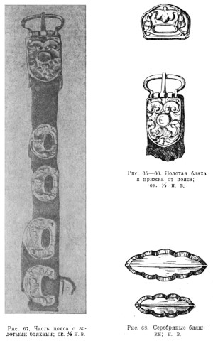Под тазом — серебряная наременная обойма и обломок серебряной пряжки. У таза, слева — фигурное серебряное кольцо и два таких же кольца у таза под костяком (рис. 55). Под колчаном вдоль левой части таза — кусок ремня с бляшками, серебряная пряжка с железной задней частью и язычком, две серебряных обоймы, две наременных бляшки в виде вырезного листка (рис. 66), один серебряный наременный наконечник и железный крюк (рис. 57).