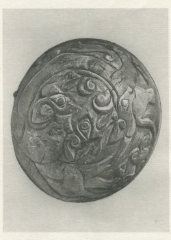 ^ Plate 47. Ornamental plate, cast (?) bronze; China (?), Siberian import; Stoclet collection, Brussels; Chinese, Bronzes, Plate 11 C.