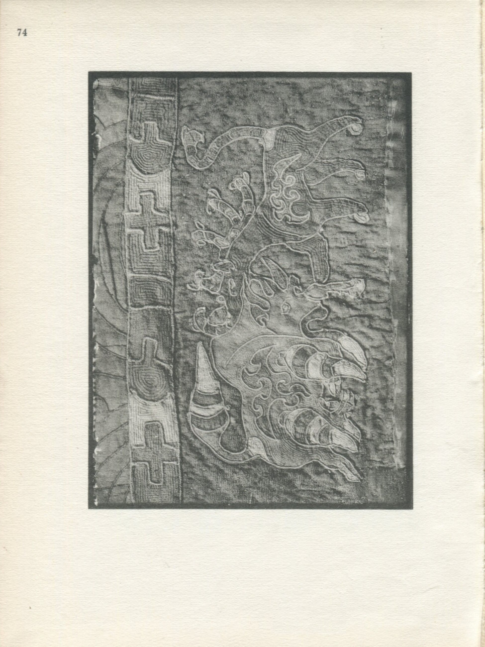 ^ Plates 73 and 74. Details of a large carpet, woven wool, with multicolour applique work in purple, brown and white. The outlines are stitched over with a cord. The scene is embroidered with various patterns; about 1/2; native Scytho-Siberian work, betraying Greek influence; found with Chinese imports of the Han period during the excavations of the Kozlov Expedition to Mongolia in 1924. Now in the Academy of Archaeology and Ethnology, Leningrad. Plate 73. Griffin and elk. Boroffka, l.c., Fig. 2, Yetts, Plate II, C. Plate 74. Yak and horned feline monster. Boroffka, l.c., Fig. 3, Yetts l.c., Plate II D. With the bronze on Plate 72 A, and the nephrite plaque on Plate 72 B, may be compared the Siberian gold plaques figured on Plate 52 A & B. There can be no doubt that the figure of the highly stylized winged dragon on the Chinese bronze and the birds’ heads of the dragon on the nephrite plaque go back to the same prototypes – the Iranian winged lion-griffin and the Greek eagle-griffin respectively — as the figures on the Siberian objects. Plate 72 B should further be compared with the Scythian and Siberian representations of the same motive exemplified on Plates 13, 14, 45, etc. The manner in which the two bezels of the jade ring are expanded in the places corresponding to the shoulders and hips demonstrates the Chinese artist’s indebtedness to Scytho-Siberian models. That the scenes of combat between beasts on the carpet from Mongolia, Plates 73 and 74, are native Scytho-Siberian work is proved by their agreement in individual motives with those on Scytho-Siberian objects. The griffin, for instance, may be compared with those on the girdle from the Kuban district (Plate 46), and on the gold plaque depicting an eagle-griffin and a yak (Plate 50). The incrustation of variegated stones on the gold is imitated on the carpet by sewing on variantly coloured threads. The striped bunches of hair on the tail and on the legs of the yak here coincide exactly in shape with those on the bronze plaque (Plate 53 A). In like manner the way in which the branches of the feline beast’s horns as well as his tail and elongated snout terminate in birds’ heads is thoroughly Siberian in style. Parallels are furnished by Plates 48 and 49 A. At the same time the plan of the scene of combat between elk and griffin and the attitude of the yak, charging head-down, are typically Greek. In Greek art such compositions were in vogue from the archaic period onwards. On the other hand, they are strange to the Scytho-Siberian animal style proper. So these fragments furnish us with convincing proof that classical Greek art had exerted its influence even in Central Asia, right to the borders of the Gobi Desert.