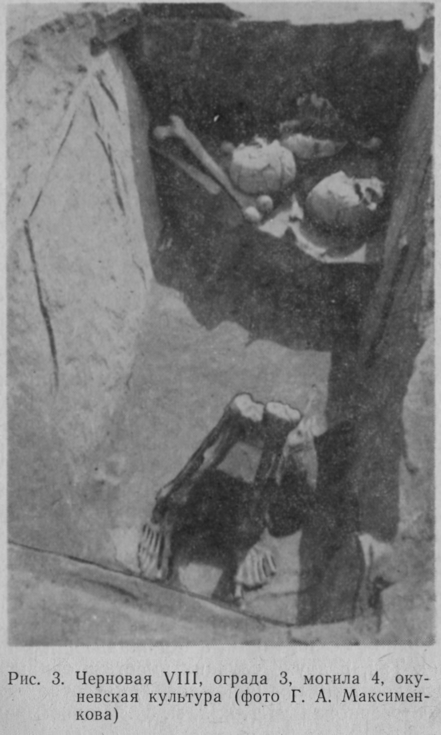 жали 8 черепов (6 женских, 2 мужских). Лишь один череп имел нижнюю челюсть и, видимо, принадлежал похороненной женщине. Не ясно, положили ли с верхним погребённым все черепа или в заполнении оказались и черепа от нижних скелетов. Так или иначе не менее 5 черепов были погребены с ним (Сыда V, к. 3 м. 1). Лишь в одной могиле черепа лежали вместе с двумя скелетами, однако, судя по размещению, они также были положены одному из погребённых. Неграбленная могила была раскопана автором в 1975 г. у с. Лебяжьего, на правом берегу Енисея. В каменном ящике, 140×90×5,5[55] см, из вертикально поставленных плит, лежали валетом два скелета взрослых людей, оба на спине с сильно согнутыми в коленях и поднятыми вверх ногами. Ориентированы головой на ЗСЗ и ВЮВ. Выше правого локтя одного из них находились рифлёный костяной игольник и шило из нижней части метоподии молодой косули (?). Выше правой половины таза — кучка из 10 подвесок, среди них семь копытных фаланг косули и зуб парнокопытного (определения Н.М. Ермоловой). Все просверленные, они, видимо, украшали сумочки или свешивались с пояса как брелок. Второму погребённому вещей не положено, кроме небольшого сосудика, помещённого в ногах. Тут же, у сосуда, поверх ног скелета, кучкой
