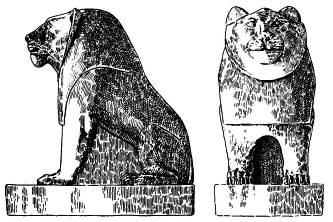Несмотря на различия в фауне и деталях пейзажа, не позволяющих непосредственно связывать майкопские находки с Египтом (не говоря уже об отсутствии других данных), поразительное стилистическое сходство изображений на майкопских сосудах с некоторыми важнейшими канонами египетского рисунка, безусловно, заслуживает внимания. К их числу прежде всего относится традиционная моделировка львиной гривы рельефной линией на лапах и туловище и спускающимся из-под уха треугольником — воротником. Скульптурное изображение сидящего льва из Иераконполя (рис. 6), чрезвычайно близкое в этом отношении к фигуре льва на втором майкопском сосуде и к львам-бляшкам из Майкопского кургана, позволяет увидеть, что анфас воротник представляет собой круглое жабо. Этот приём сохраняется в египетском искусстве и в гораздо более позднее время, вплоть до Тинисских сфинксов Нового царства.