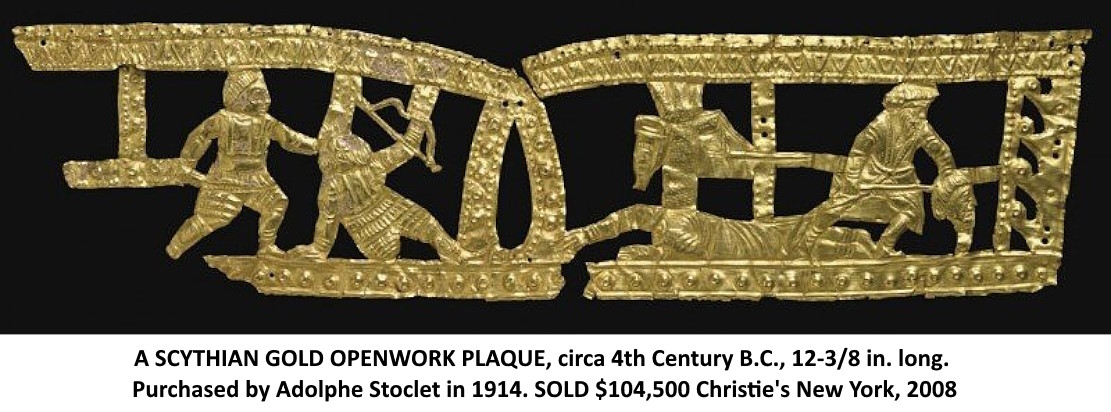 вары в трёх батальных эпизодах. Одна пластина (в Эрмитаже сейчас хранится копия лишь её части; оригинал в 1960-х гг. находился в частном собрании [перепродан на Кристи в 2008 г., см. фото]) явилась предметом специального рассмотрения В.А. Ильинской (1978). Опираясь на то, что ближайшей аналогией пластине является гребень из кургана Солоха, ставший известным почти через двадцать лет после появления пластины, Ильинская пришла к выводу о её подлинности.