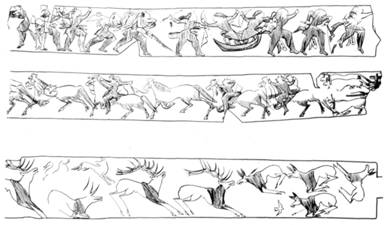 они были раскрашены. Не совсем ясно, что означают рисунки, где целые группы людей показаны в столкновениях и борьбе. Может быть, это историко-эпические сюжеты или, может быть, здесь нашли отражение вполне реальные события того времени. Наиболее полно сохранились рисунки на планке с изображением батальных сцен на обеих сторонах (прорисовка над витриной 8). На одной стороне показаны в общем движении справа налево вооружённые всадники, ведущие в поводу двух коней. Их преследуют два других всадника, вооружённые сложными составными луками. Справа на планке изображены бегущие быки