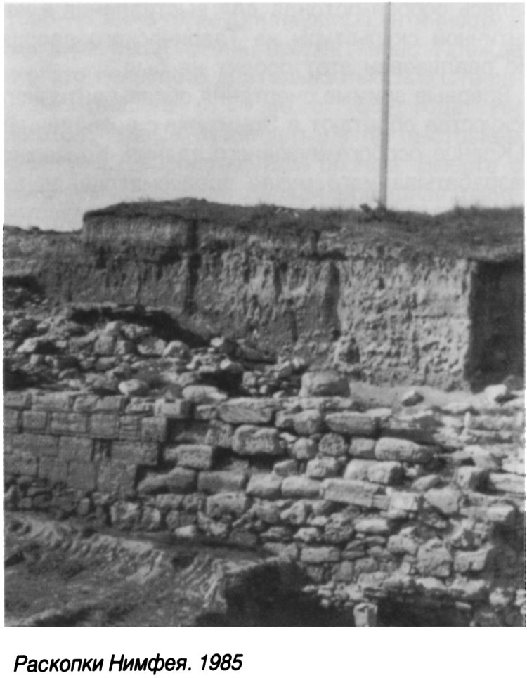 заметную роль играли выходцы с острова Самоса. В ходе исследования городища были определены его границы, прослежена часть оборонительных стен, открыты важные культовые комплексы — святилище Деметры (VI-III вв. до н.э.) и святилище подземных богов (VI-V вв. до н. э.). С 1966 года (руководитель Н.Л. Грач) расширились масштабы исследования городища. В его центральной части раскопаны улицы, искусственные террасы; открыты остатки зданий эллинистической эпохи. Важным вкладом в изучение хозяйственной жизни было открытие двух виноделен (V-IV вв. до н.э.) — древнейших свидетельств виноделия не только в Нимфее, но и во всём Северном Причерноморье. В последние годы на южном участке городища ведётся исследование уникального комплекса зданий эллинистической эпохи, расположенных на террасах склона. Найденные здесь алтари, культовые приношения, обломки статуй свидетельствуют о том, что здания принадлежали храму-святилищу, посвящённому богам — покровителям мореплавания. В одном из помещений комплекса найдена полихромная штукатурка III века до н.э. с процарапанными на ней рисунками кораблей и разнообразными надписями. Проводившиеся экспедицией в 1973-1978 годах исследования