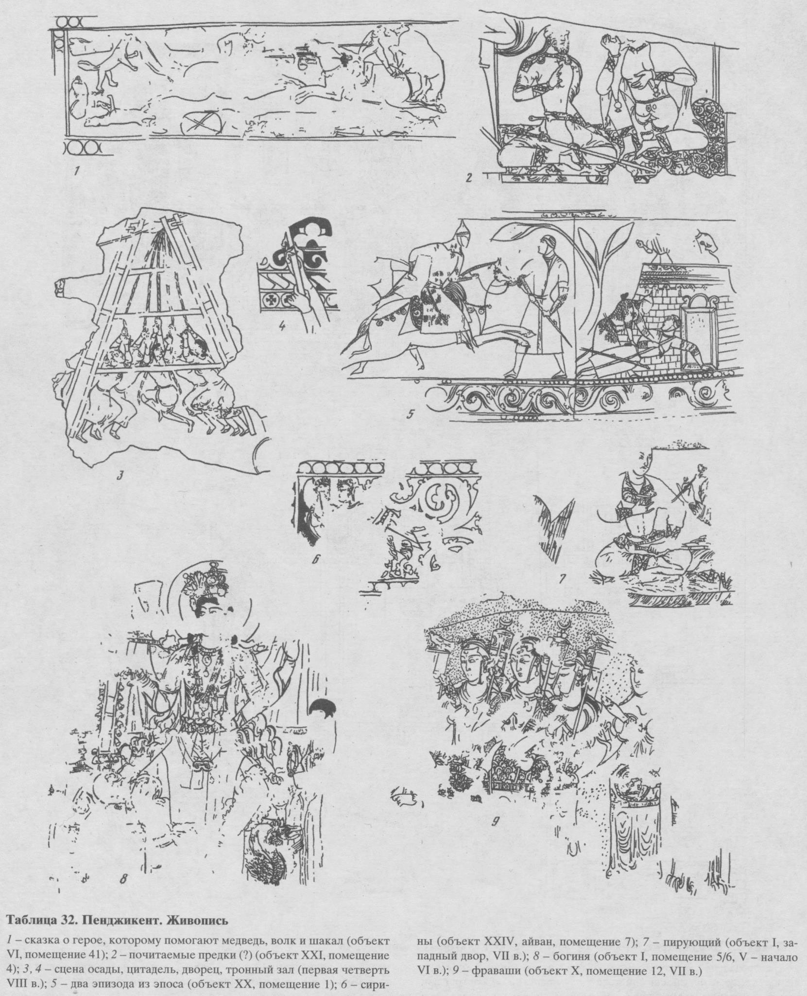 ^ Таблица 33. [стр. 277] Пенджикент. Живопись.1 — план жилища (объект XXV); 2 — помещение 28, вид с юга. Реконструкция, 3 — роспись южной стены (помещение 2, объект XXIV); 4 — южная стена; 5 — увоз урожая и пир (северная стена помещения 28, объект XXV). Первая четверть VIII в.