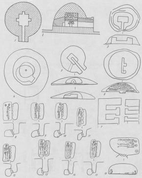 ^ Таблица 29. [с. 273]Пенджикент. Детали поясного набора и украшения. VII-VIII вв.1-8 — пряжки; 9-14, 17-21, 28 — накладные бляшки; 15, 16, 22, 23, 26, 27, 29, 30 — наременные наконечники; 24, 25 — пронизки (вид с двух сторон); 31, 32 — «самоварчики»; 33, 40 — брактеаты; 34, 35, 49, 50, 53, 60 — перстни с изображениями на щитке; 36-38, 45, 46 — серьги; 39 — амулет-идольчик; 41 — печать и отпечаток с неё; 42 — бубенчик; 43, 44 — украшения ножен меча; 47, 48 — матрицы; 51 — кольцо с геммой; 54 — ложечка; 55 — печать; 56 — весы; 57-59 — кольца; 1-32, 34, 35, 37, 39, 42-50, 52, 53, 56-60 — бронза; 33, 36, 40 — золото; 41 — камень; 51, 54 — серебро.