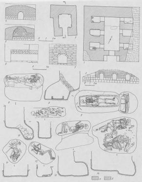 ^ Таблица 42. [с. 286]Погребальные памятники Чача.1-7 — планы наусов; 8-16 — планы захоронений в подбоях.