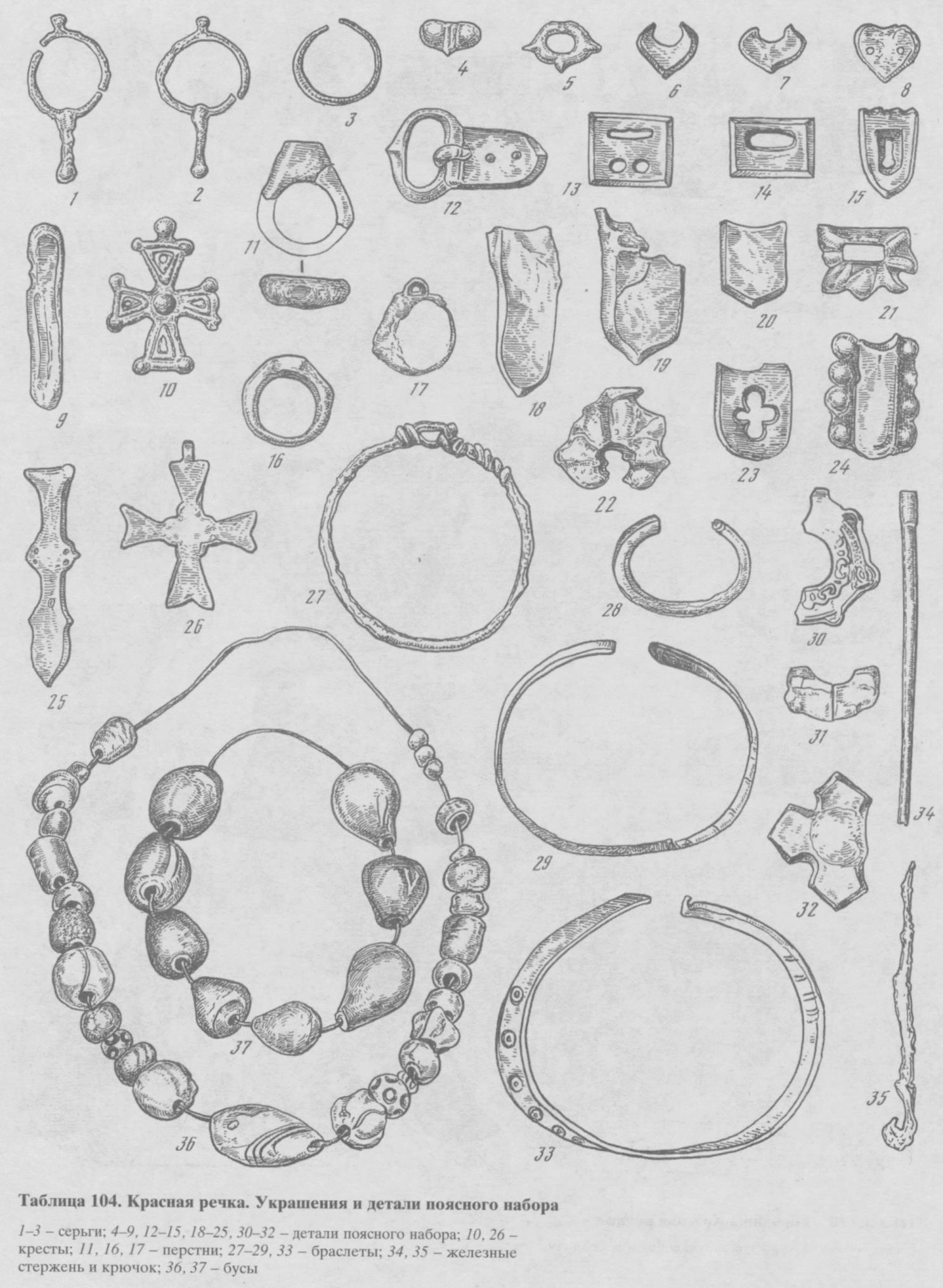 ^ Таблица 104. [с. 348]Красная речка. Украшения и детали поясного набора.1-3 — серьги; 4-9, 12-15. 18-25, 30-32 — детали поясного набора; 10, 26 — кресты; 11, 16, 17 — перстни; 27-29, 33 — браслеты; 34, 35 — железные стержень и крючок; 36, 37 — бусы.