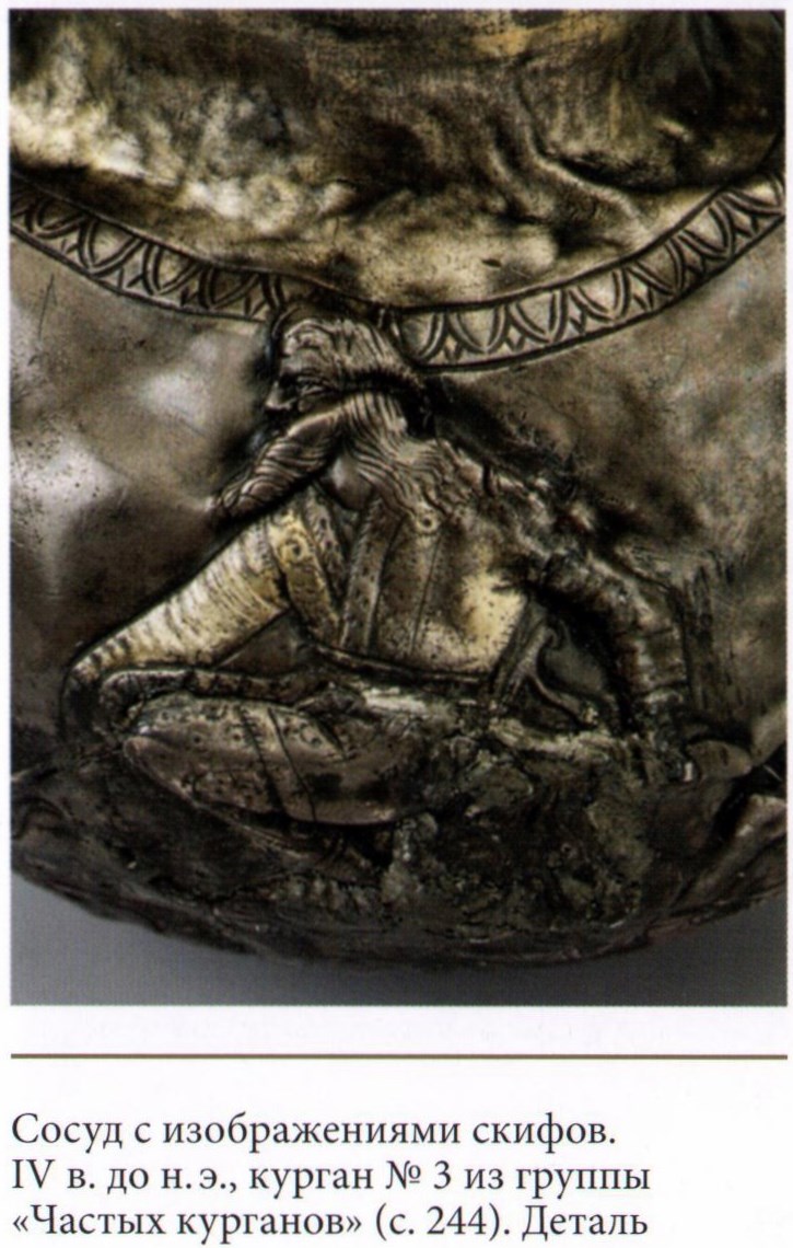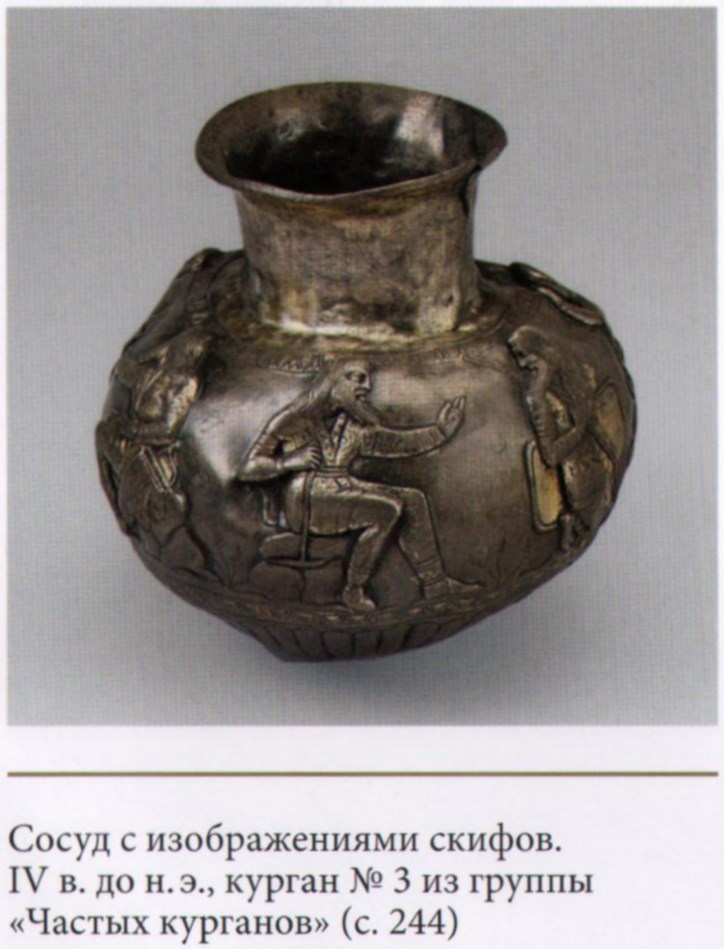 Сосуд с изображениями скифов. IV в. до н.э., курган №3 из группы «Частых курганов» (с. 244).(Открыть в новом окне) |