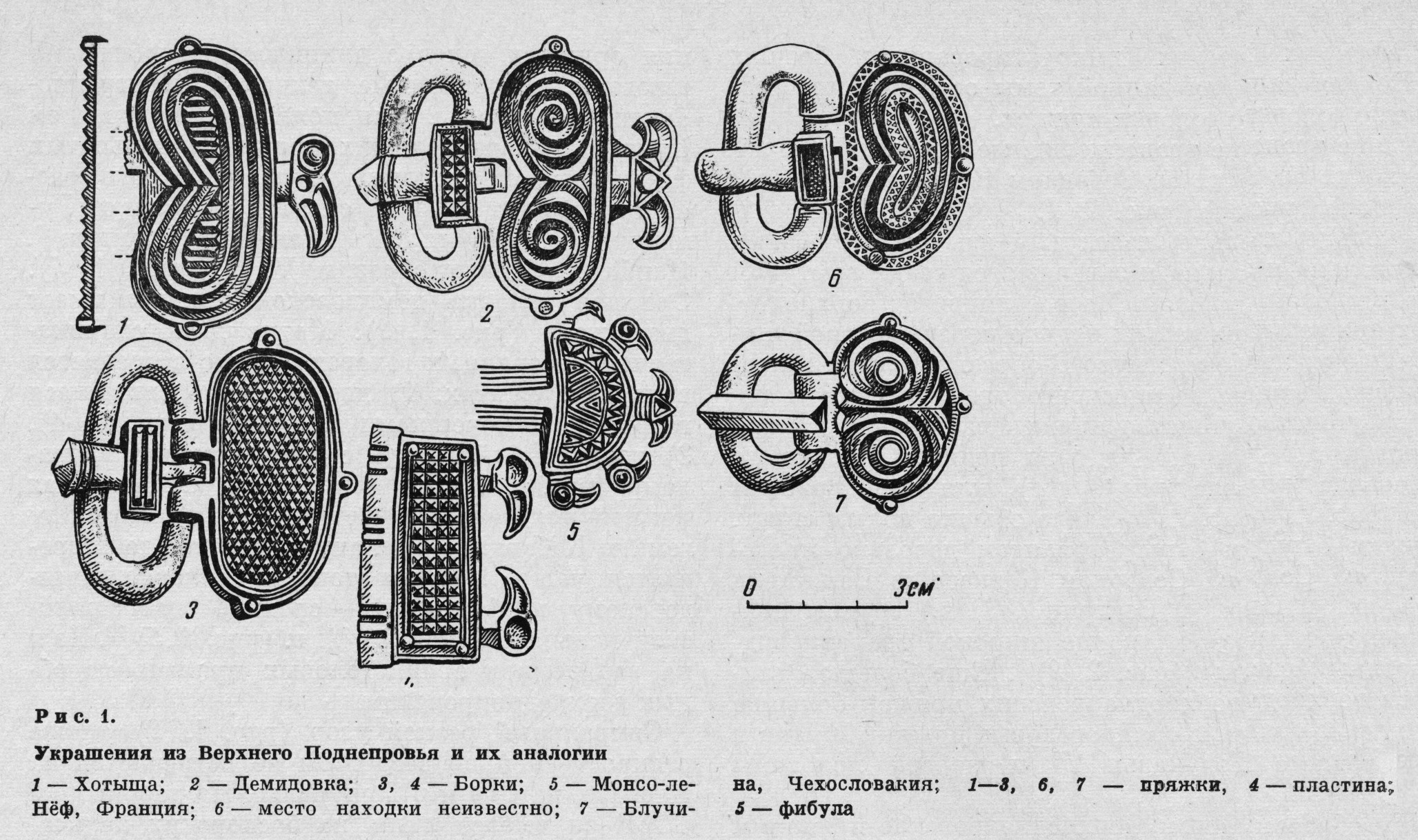 Резной решётчатый орнамент кроме пряжек из Демидовки и Борков (рис. 1, 2-4) имеется на пластинке из Посудичей Брянской обл. (рис. 2, 7), на дунайских и италийских пряжках второй половины V и VI в., на боспорских и меровингских пальчатых фибулах VI в., на одной днепровской пальчатой фибуле VII в. [16] Однако недостаток местных образцов (при простоте самого орнамента) пока не позволяет судить о том, как появился этот мотив в Верхнем Поднепровье.
