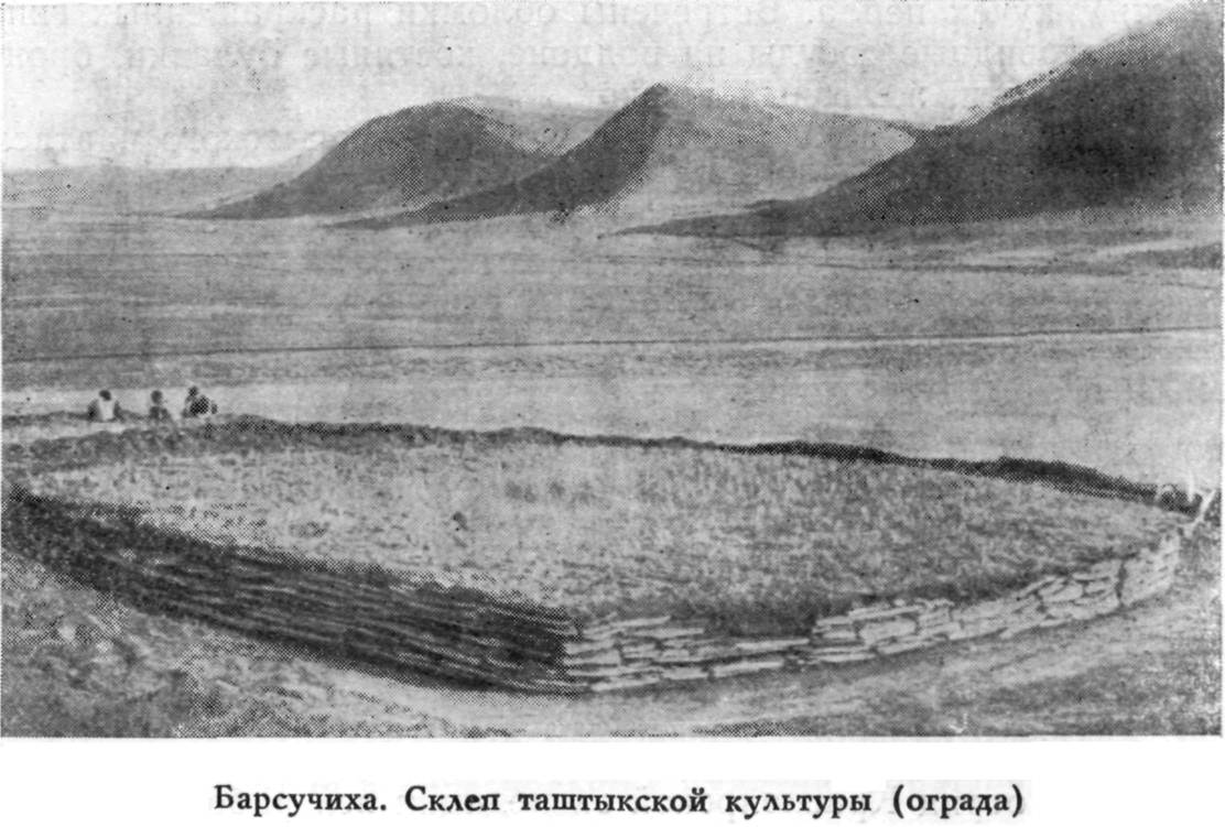 Позднетагарский отряд Красноярской экспедиции вёл работы на левом берегу Енисея в 12 км к северу от с. Батени, у подножия горы Барсучиха, на территории могильника Барсучиха I, расположенного на гребне пологого увала. Здесь раскопан большой курган диаметром 40 м и высотой около 3,5 м с пятью массивными столбообразными плитами в основании насыпи. Под насыпью обнаружена прямоугольная ограда высотой 1 м из крупных плит, горизонтально уложенных друг на друга. Снаружи вдоль каждой из стен ограды и по её углам поставлены 20 массивных столбообразных плит. На двух из них выбиты изображения людей (на южной — стилизованное изображение группы человеческих фигур, на северной — большой женской фигуры в одежде). В ограде на глубине 2,5 м вырыта могильная яма, в которую поставлен сруб в девять венцов, сохранившийся на высоту 1,30 м. Между стенкой ямы и срубом шёл тын из вертикально поставленных брёвен. Пол выстлан полубрёвнами. На уровне древнего горизонта могильная яма перекрыта накатом из массивных брёвен. Накат служил полом верхнего помещения, представлявшего собой сруб из таких же брёвен. Наиболее полно — в пять венцов, на высоту 1,20 м — сохранилась южная стена. На полу нижнего сруба стояли два вертикальных столба, которые, вероятно, были опорой деревянного перекрытия верхнего сруба. Сверху всё это покрыто берёстой. Наземное деревянное сооружение на расстоянии около 2 м от стен со всех сторон окружено стеной, сложенной из плитняка (крепидой) и служившей основанием для какого-то сооружения из дёрна, воздвигнутого над могилой. Перед нами — родовой склеп, состоящий из подземного и наземного помещений, со следами сильного пожара в наземной части. В склепе было погребено не менее 30 человек. Остатки захороне-