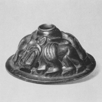 По своим физическим признакам создатели культуры плиточных могил сильно отличались от древнего населения западной половины Южной Сибири отчётливо выраженными монгольскими чертами. Памятники потомков этого населения в Забайкалье позднейшего хуннского времени известны сейчас по немногим исследованным поселениям и могильникам, среди которых особенно важное значение имеет Иволгинское городище с расположенным возле него грунтовым могильником. [19] Из огромного количества разнообразных находок на этом городище, примечательном тем, что это пока единственный памятник, свидетельствующий о существовании у хуннов наряду с кочевым скотоводством осёдлого земледелия и развитого ремесла, отметим сходную с минусинскими бронзовую четырёхугольную застёжку с ажурным орнаментом в виде горизонтальных полосок, означающих, вероятно, змеек, отличающуюся от других предметов этого рода своей исключительной простотой и геометрической орнаментальностью (илл. 214). В могильнике возле городища было обнаружено погребение с парой ажурных застёжек, находившихся в области живота, что не оставляет сомнений в их принадлежности к поясу, а не к какой-либо другой части одежды, а тем более к украшениям гроба. На этих застёжках представлена сцена борьбы ящерообразного дракона с двумя тиграми (илл. 213). В том же погребении оказалась пара литых круглых бляшек со скобками на обороте. На лицевой стороне каждой из них горельефом голова медведя в фас, а вокруг неё изогнутое туловище этого зверя (илл. 156).