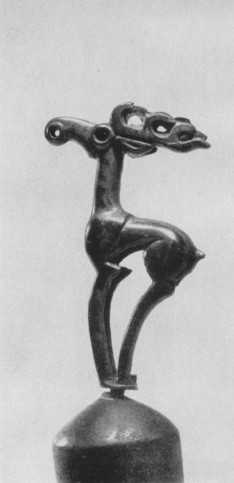 например, головы лося и барана на ручках ордосских кинжалов карасукского типа с их как бы переломленной, отвисшей губой и выпуклыми глазами очень похожи на чудовищ по сторонам луристанских божеств на бронзовых навершиях вотивных булавок, а головка, должно быть, козла с петлеобразным рогом на карасукском ноже близка к головке того же рода на луристанских бронзовых рукоятках. И другие луристанские головки животных, встречающиеся на шильях и наконечниках точильных камней, похожи на карасукские.