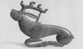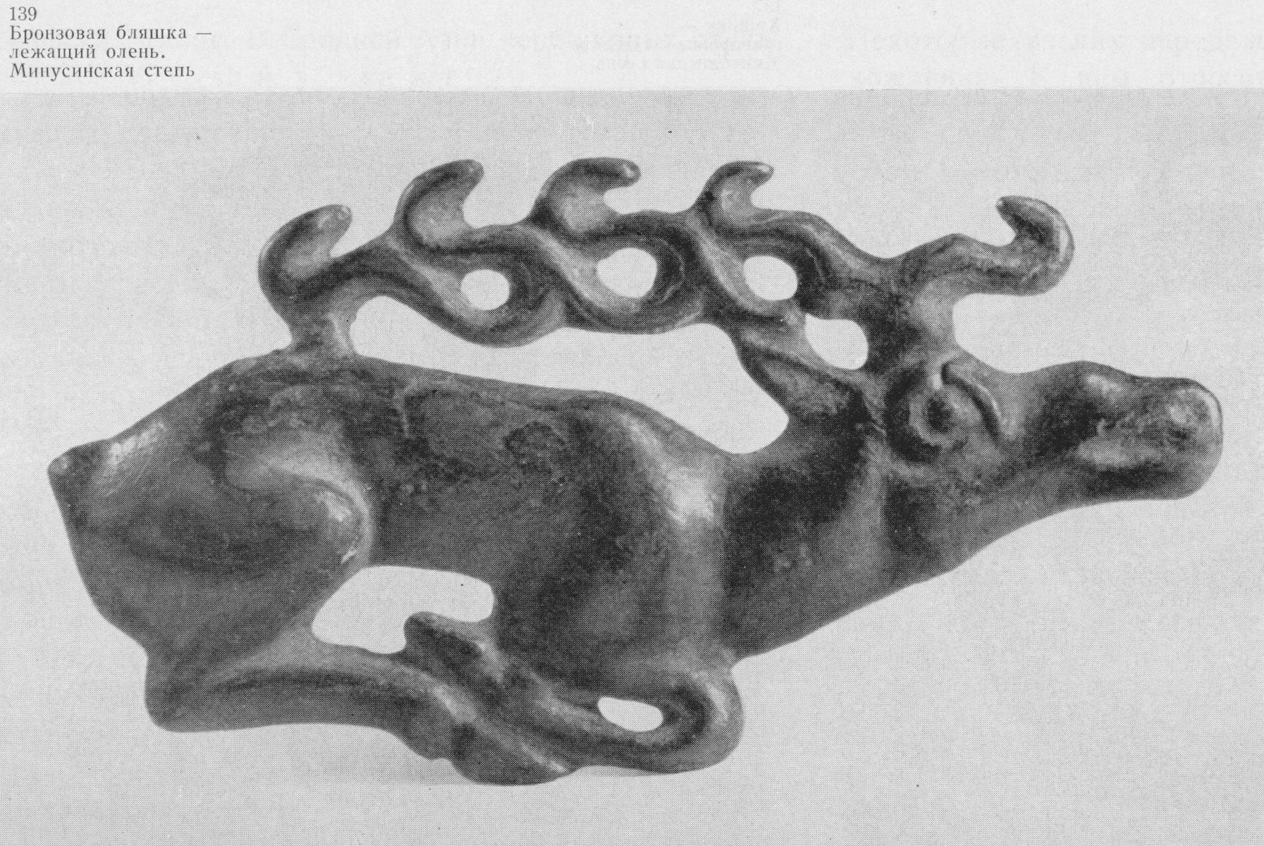 Так, например, обычный в раннескифском искусстве мотив оленя, лежащего с поджатыми ногами, как и оленя вообще, вовсе не известен ни карасукскому, ни тесно связанному с ним искусству раннего этапа тагарской культуры. Изображения оленя распространяются в Минусинской котловине только с V в. и сразу в двух вариантах — лежащего с поджатыми ногами (илл. 139-[140]-141) и стоящего (илл. 142). Бывают и только одни головки оленя с устремлёнными вверх рогами. Возникнув в формах, близких к изображениям этого животного в искусстве Восточного Казахстана, образ оленя получает в Минусинской котловине очень широкое распространение и, подвергаясь дальнейшей схематизации, приобретает специфические минусинские черты, в большей степени соответствующие признакам лося, чем первоначальному виду этого животного. У позднейших изображений оленя рога превращаются в гребень, а ноги сливаются в прямую полоску без прогиба. Рельефные фигурки оленя встречаются на ручках ножей, расположенные вертикальным рядом одна над другой. Появляются бляшки с рельефными изображениями и других животных, например, козла, лошади, тигра, барана, волка и т.д.