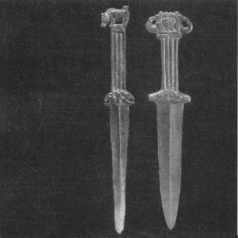 соответствия в находках из других областей «скифского мира». Так, например, кинжалы с бабочковидным или сердцеобразным перекрестьем и треугольным клинком (илл. 119) близко сходны с железными кинжалами или мечами скифской культуры Причерноморья, где встречаются и бронзовые образцы того же рода. Однако между минусинскими и причерноморскими кинжалами кроме сходства имеются и существенные различия. Так, у минусинских кинжалов никогда не встречается характерное для причерноморских брусковидное навершие на рукоятке, а форма перекрестья у тех и других в деталях различается одна от другой. Минусинским кинжалам свойственно перекрестье с широко расставленными бабочковидными крыльями, какого не бывает у причерноморских, и, с другой стороны, у минусинских кинжалов не получает распространения сердцевидное перекрестье, обычное в Причерноморье. Ввиду этого причерноморские и минусинские кинжалы не могут находиться в зависимости друг от друга, их сходство основывается, очевидно, на происхождении из одного и того же источника, в котором следует искать их прототипы. Поскольку сходные с минусинскими кинжалы имеются в Западной Сибири, Средней Азии и Иране, весьма вероятно, что они, как и причерноморские, восходят к иранским или среднеазиатским образцам. В сравнении с северочерноморскими они представляют другую линию развития этого вида оружия. В Минусинской котловине кинжалы с бабочковидным перекрестьем появляются едва ли раньше V в. до н.э. Другой тип минусинского кинжала — кинжал с прямым перекрестьем или «с шипами» имеет прямых предшественников в местной карасукской культуре (илл. 116), хотя последние, в свою очередь, связываются с ещё более ранними и широко распространёнными кинжалами, возникшими в Передней Азии и оттуда проникшими как на восток, так и на запад. Во всяком случае, в минусинской культуре кинжалы с шипами представляют карасукскую традицию, как, впрочем, и в других районах Сибири, где существовали сходные с ней культуры.