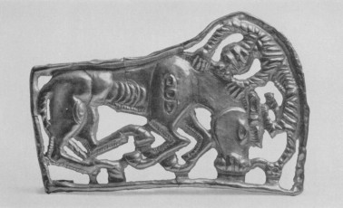 Своим орнаментально-декоративным характером с подчёркнутой симметрией построения эти застёжки сближаются с четырёхугольными бронзовыми пластинами сибирского и ордосского происхождения с изображениями пары быков, лошадей, козлов или верблюдов иногда с остатками дерева между ними и с золотыми застёжками Сибирской коллекции с фантастическими зверями по сторонам стилизованного дерева. Однако в начальном своём варианте они, несомненно, древнее последних и стоят в одном ряду с ордосскими же пластинами с изображением поединка богатырей, то есть не моложе III в. до н.э. Ряд застёжек с геральдическими композициями, в одном случае со сценой схватки лошадей (Дэрестуйский могильник), отличается тем, что их рамка орнаментирована не листовидными, а удлинённо четырёхугольными ячейками для инкрустаций. Такой орнамент на рамке характерен для застёжек с изображением двух симметрично поставленных один возле другого быков с повёрнутой в фас вместе с передней частью туловища наклонённой к земле головой (илл. 212). В некоторых случаях такой орнамент сочетается с листовидными ячейками, занимающими верхнюю часть рамки, как, например, на застёжке с изображением битвы лошадей, представленной находкой в Ордосе. Замечательно, что изображений животных в столь сложном повороте, в котором представлены быки на указанных застёжках, нет ни в одном другом произведении скифо-сибирского искусства. Что касается орнамента из прямоугольных выемок, то он имеется вдоль стержня рога грифона в сцене борьбы его с тигром на золотых Р-образных застёжках в Сибирской коллекции и, по-видимому, типологически раньше листовидных ячеек на рамке. Одновременно с теми и другими бытовали рамки, украшенные различными видами верёвочки.