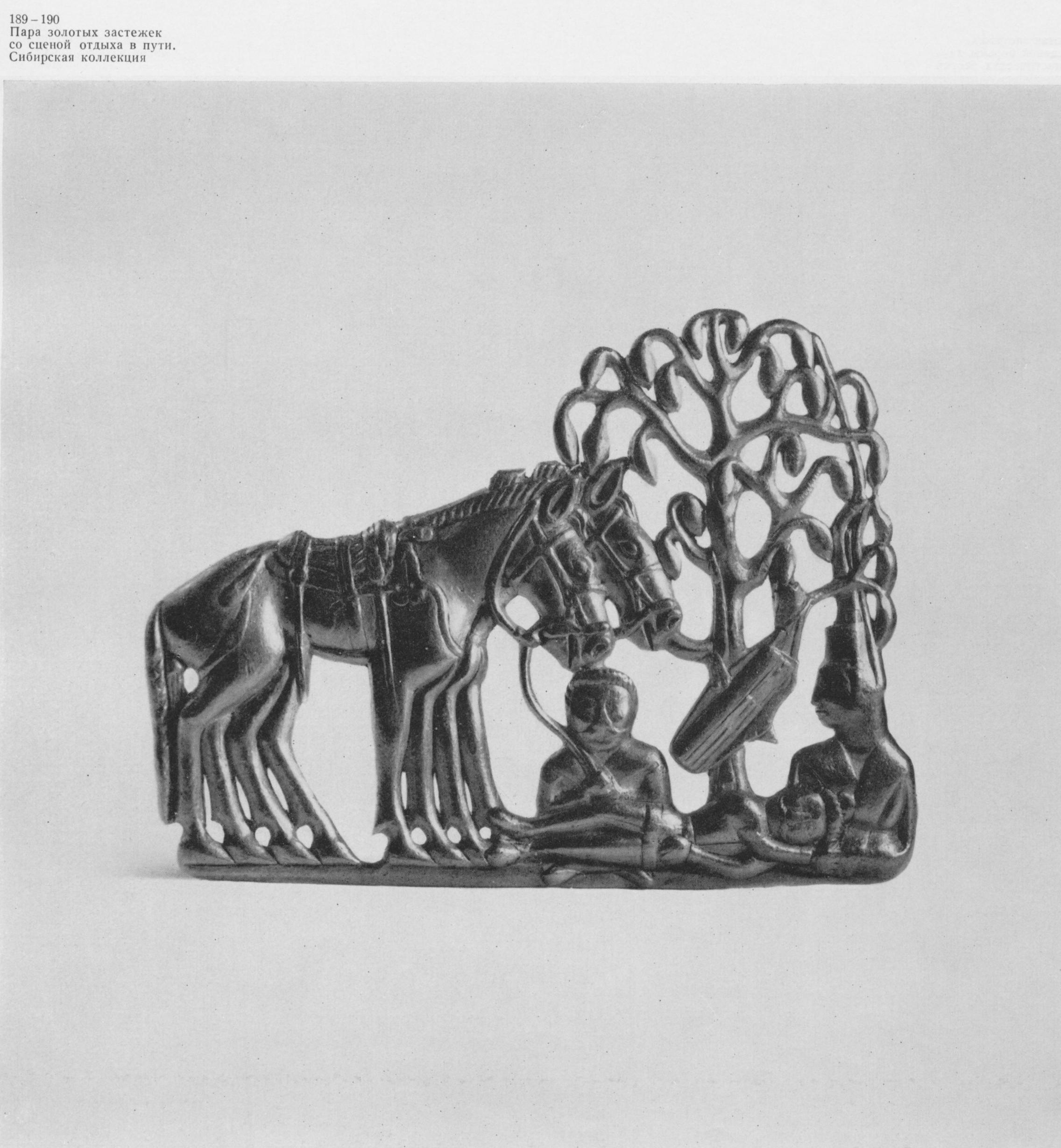 Не менее интересно содержание изображений на второй паре застёжек (илл. 189-190). Здесь представлено высокое дерево с ветвями, заканчивающимися опущенными листьями. Под ним расположилась на отдых группа людей, состоящая из двух мужчин и одной женщины. С ними пара осёдланных лошадей, из чего можно заключить, что на одной лошади ехали два человека, должно быть, мужчина с женщиной. Мужчина и женщина сидят с поджатыми ногами по сторонам дерева, а на их коленях, вытянувшись во весь рост, лежит второй мужчина. Одна его рука подложена под голову, а другая протянута вдоль туловища. Он, по-видимому, спит, хотя и изображён с открытыми глазами. В руках сидящего мужчины повод от пары лошадей, завершающих группу отдыхающих с одной стороны. На нижнем сучке дерева висит колчан, соединённый с футляром с вложенным в него луком.