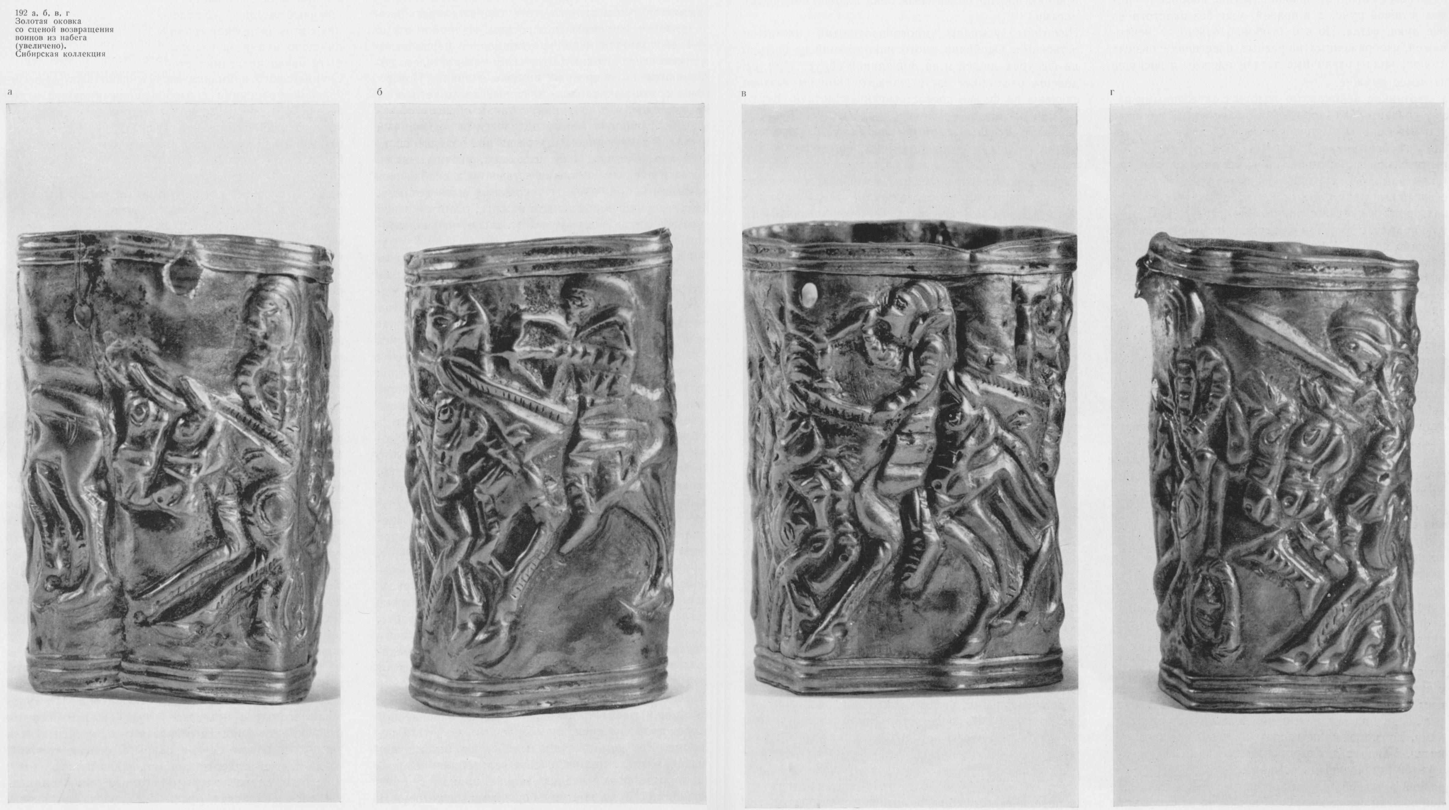 Кроме рассмотренных застёжек в Сибирской коллекции повествовательная композиция имеется на призматической оковке какого-то квадратного в сечении предмета, спаянная из тонкой золотой пластинки с рельефными, подправленными резцом изображениями (илл. 192 а, б, в, г). Верхний и нижний края её обрамлены валиками, а пространство между ними занято группой всадников, едущих в одном направлении и расположенных в нескольких планах так, что одни фигуры прикрывают другие. Два всадника с лошадями, на спины которых перекинуты трупы, по-видимому, погибших товарищей. Они положены поперёк лошадей так, что с одной стороны свешиваются ноги, а с другой головы и руки. Всадники в плотно охватывающих голову и подвязанных под подбородком головных уборах, вероятно, башлыках, в коротких кафтанах с собранными поперечными складками рукавами и в узких штанах. В руках у них оружие — у одного копьё с листовидным пером, у другого, вероятно, меч, а у двух луки. У всадника, едущего впереди, оружия не заметно. Кони с подстриженной гривой, в уздечке и с седлом, закреплённым нагрудным и подхвостным ремнями с привесками. Несмотря на грубость исполнения и непроработанность деталей, композиция в целом отличается свободой построения и динамичностью образов. Она, без сомнения, должна быть поставлена в один ряд с жанровыми сценами на застёжках. Здесь также представлен эпизод какого-то эпического сказания, настолько популярного, что относящиеся к нему сцены помещались на мелких вещах бытового назначения в невыгодном для обозрения виде и в самом грубом исполнении, хотя, как в данном случае, оригинал носил все черты, свойственные того же рода изображениям на застёжках.