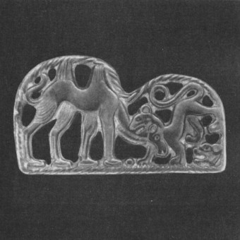 Золотая Р-образная застёжка Сибирской коллекции со сценой нападения тигра на лошадь, обведённая по краю узкой рамкой в виде верёвочки, уже приводилась в качестве звена, связывающего в типологическом ряду Р-образные застёжки с прямоугольными в рамке. Эта застёжка не единственная в своем роде. Среди ордосских находок имеется застёжка с двумя полукруглыми выступами, своей формой напоминающая сибирскую застёжку со сценой охоты в лесу, но, в отличие от нее, обведённая узкой рамкой в виде верёвочки (илл. 201). На ней представлено нападение тигра на верблюда. Маленький зверь с высоко поднятой задней частью туловища, заканчивающегося S-образно изогнутым хвостом, перекусывает шею двугорбого верблюда с низко опущенной головой. Под задними лапами тигра в нижнем углу рамки показана ещё одна голова хищного зверя. У верблюда ляжки, горбы и низ шеи покрыты шерстью, обозначенной слабо изогнутыми линиями, напоминающими трактовку шерсти в ранних произведениях сибирского искусства. Вместе с тем плоские, слабо расчленённые фигуры персонажей заметно отличаются от реалистических образов раннего времени, что указывает на позднее происхождение этой застёжки.