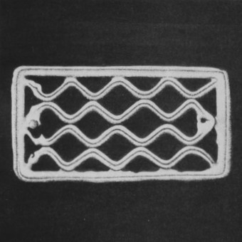 Из Иволгинского городища происходит застёжка, отличающаяся исключительной простотой и геометричностью орнаментации (илл. 214). Она представляет собой гладкую четырёхугольную рамку, внутри которой вдоль протянуты четыре волнистые полоски, по-видимому, означающие змей, так как на концах их имеются небольшие расширения — головки. Своей геометричностью эта застёжка может сравниться только с несколькими минусинскими и одной ордосской застёжками, у которых пространство внутри украшенной листовидными ячейками рамки занято чисто геометрическим узором из двух рядов ломаных линий, разделённых продольной прямой полосой (илл. 215). Такой орнамент известен по четырёхугольной пряжке, найденной в Оренбургской области в урочище Мечет-Сай в сарматском погребении вместе с кинжалом с серповидным навершием, какие датируются III-II вв. до н.э., что в известной мере может служить указанием на хронологию минусинских, ордосской и Иволгинской застёжек. [28]