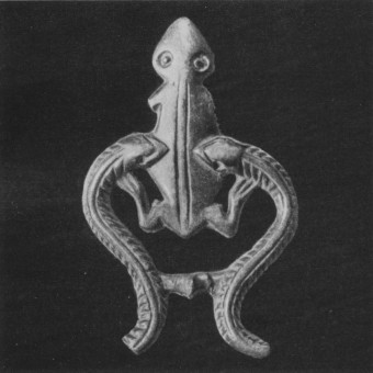 стёжки того же типа в Иволгинском могильнике в Забайкалье, относятся к последним векам до н.э. Особый интерес среди них представляют застёжки в виде фигуры лягушки с кусающими её змеями по сторонам (илл. 216).