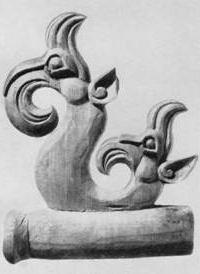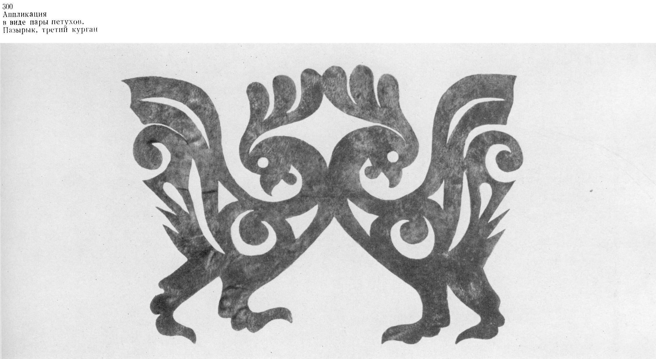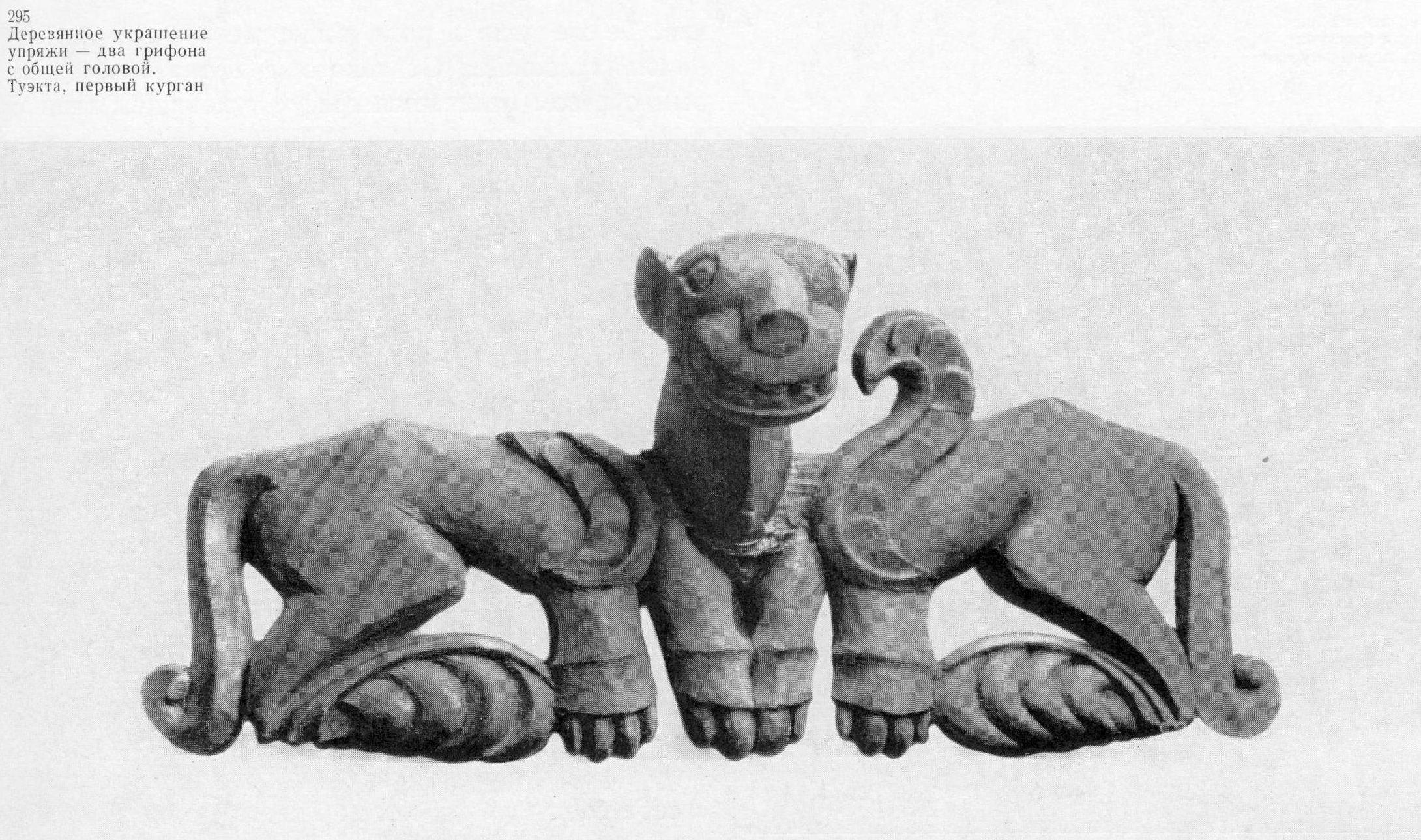Примером симметричной композиции, в которой составляющая её пара животных объединена одной головой, может служить вырезанное из дерева украшение конской упряжи из первого Туэктинского кургана (илл. 295). Обращённые друг к другу профильные скульптурные туловища двух крылатых грифонов соединены здесь общей скульптурной головой хищника, поставленной в фас. Подобного рода симметричные пары львов с общей головой особенно характерны для луристанского искусства, но геральдические композиции издавна распространены в искусстве Востока. В Ахеменидской Персии они представлены прежде всего капителями дворцов и портиков царских могил, но известны и в прикладном искусстве. [5]