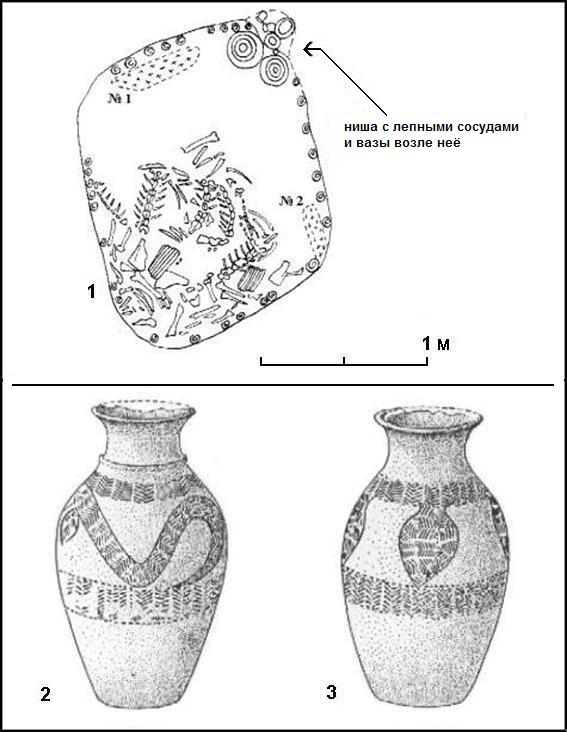 с простым баночным горшком. Вазы ни разу не встречены вместе с сосудами с «усами», котлы не совмещались с баночными сосудами. Ваза стоит либо с котлом, либо с баночным сосудом; сосуд с «усами» — либо один, либо с банкой. В нетипичной позиции стоит либо ваза, либо сосуд с «усами». В целом — налицо чёткая иерархия жертвенных сосудов. К высшему рангу относились вазы и сосуды с «усами»; показательна лепная имитация вазы, украшенная несколькими парами волют-«усов» — как бы гибрид обеих престижных форм, «зародыш» будущей минусинской традиции (Кызласов 1969: 68, рис. 17, 1). К низшему рангу относились баночные сосуды и котлы, причём приведённая группировка катакомб показывает, что и на этом уровне существовали какие-то различия между умершими, проявившиеся в разнообразии керамических наборов [4].
