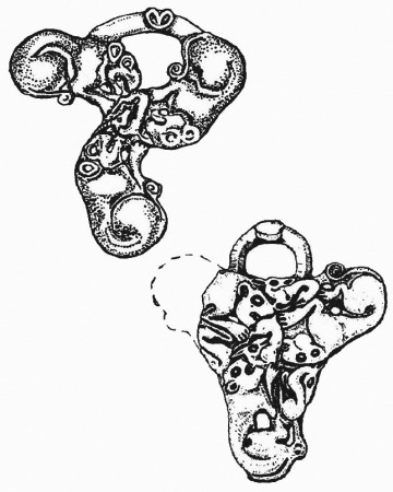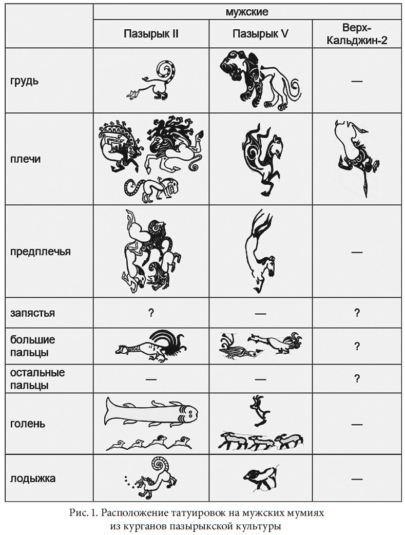 Имеющаяся ныне серия татуировок невелика, но при этом они, во-первых, поддаются первичной систематизации (Рис. 1, 3 [см. также сводный рис.]), а во-вторых, вписываются в широчайший контекст декоративно-прикладного искусства древних кочевников. В исследовании этих памятников древнего искусства особую роль сыграло обнаружение в 2004 г. новых татуировок на мумиях из Пазырыкского могильника, хранящихся в Эрмитаже. Именно благодаря этому открытию стало понятно, что можно, несмотря на малую численность находок, говорить о существовании двух устойчивых наборов изображений — условно