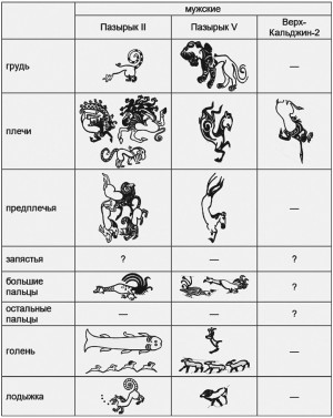 случае изображены хищники — сверху барс (?), снизу грифон или крылатый волк, композиционно с копытными грифонами не связанные (во всяком случае, эта связь не очевидна). На больших пальцах татуировали изображения птиц (их принято считать петухами) в атакующей позе, с туловищем в основании пальца и шеей, вытянутой вдоль него. Такие изображения, если сплести пальцы рук, образовывали нечто вроде сцены схватки двух птиц [3] (впрочем, парные рисунки встречены лишь один раз, в других случаях птица изображена лишь на одной руке).