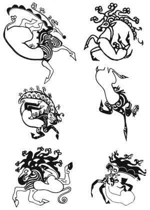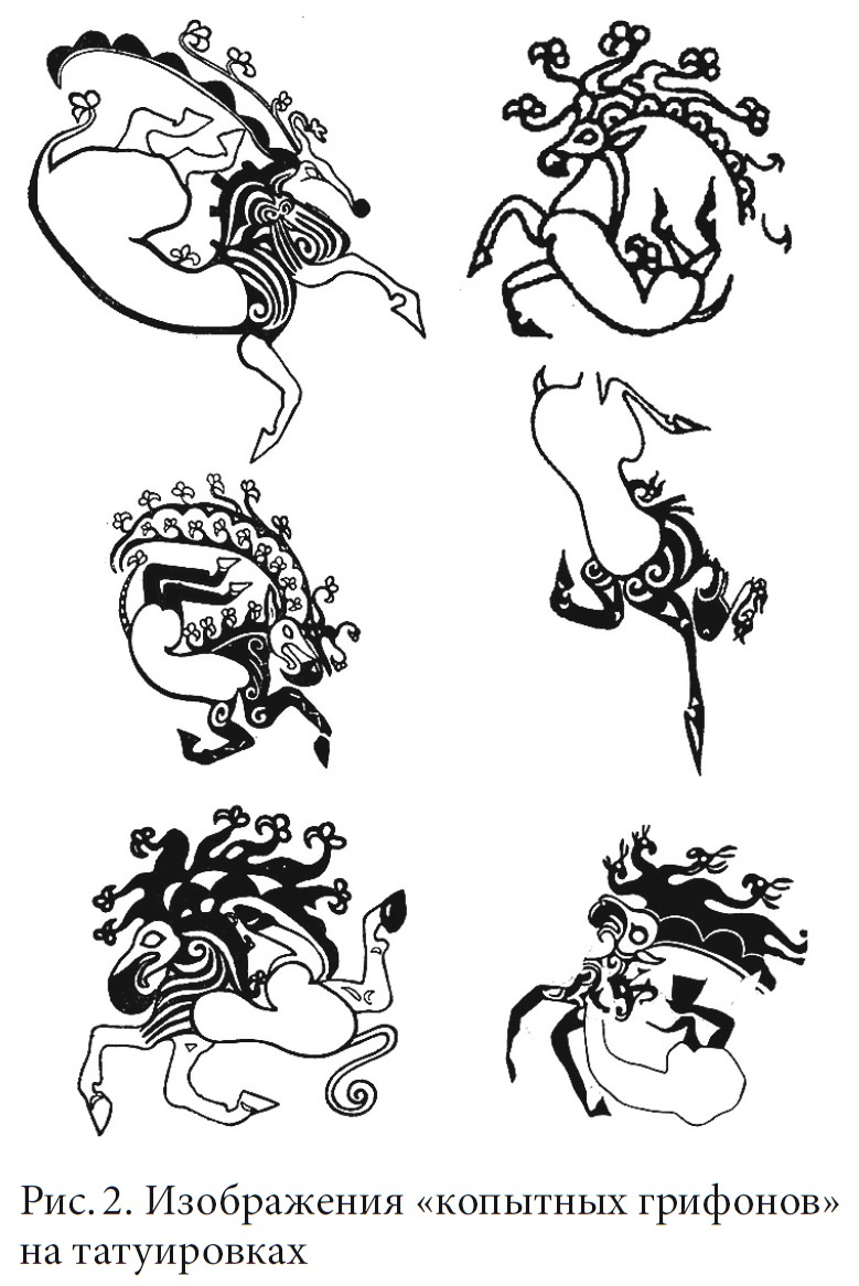 Совершенно особенное явление — образ так называемого «копытного грифона», монстра с туловищем и ногами копытного, хищным клювом и тремя рогами; два разных рога — оленя и архара [ошибка, надо: горного козла] — направлены вперёд и вверх, третий — джейрана или оленя — стелется вдоль гривы по направлению к спине; окончания рогов и отростков акцентированы головками или клювами хищных птиц [5] (Рис. 2). Изобразительная практика древних кочевников Южной Сибири и более западных областей практически не знакома с этой химерой, зато в памятниках степей Северного Китая копытные грифоны встречаются сравнительно часто. Налицо свидетельство каких-то контактов между древними кочевниками Горного Алтая и их южными и юго-восточными соседями. Особенность подавляющего большинства пазырыкских татуированных изображений этих грифонов — устойчивая «жертвенная» поза с вывернутым крупом, [6] тогда как на юге и юго-западе их изображали в самых разных позах и композициях. Алтайские татуировщики «играли» с этим фантастическим образом, превращая основные рога в сложные орнаментальные полосы, а окончание третьего рога, стелющегося вдоль шеи, иногда «отрывали» от головы и трактовали уже как торчащую из спины животного птичью головку; эти элементы иногда использовались и при изображении фантастических хищников.