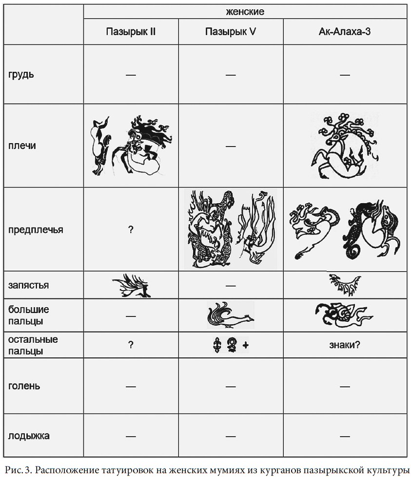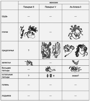 Рис. 3. Расположение татуировок на женских мумиях из курганов пазырыкской культуры.