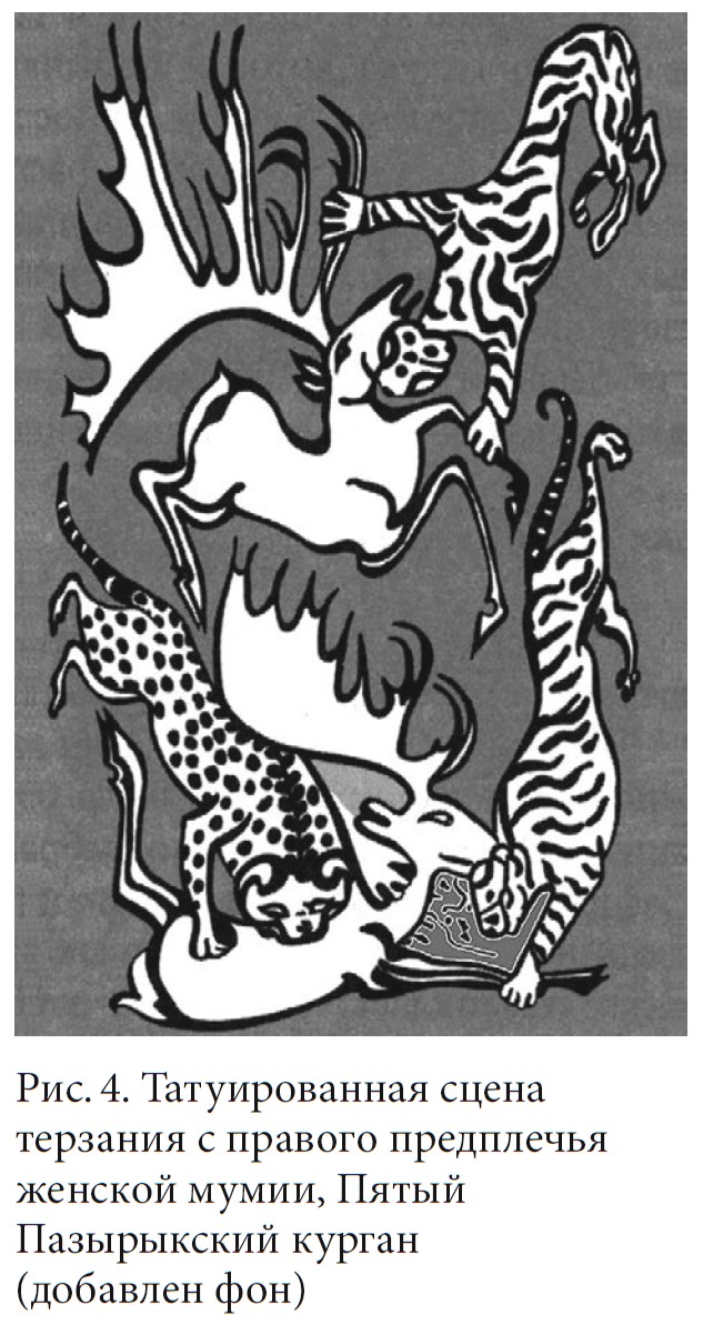 Пазырыкская татуированная сцена по сравнению с этим стандартом явно вторична, она искажена — в частности, вместо одной жертвы в центре круга хищников изображены две (возможно, ради заполнения рисунком всего предплечья), нарушена симметричность расположения фигур хищников (может быть, для того, чтобы барс оказался симметричен нижнему тигру, т.е. центральная симметрия уступила место осевой). Во всех этих искажениях просматривается творческий поиск мастера-татуировщика, стремившегося решить подлинно художественную задачу и даже, осмелюсь предположить, приносящего традиционный стандарт в жертву эстетике — т.е. шагнувшего в своём развитии дальше, чем большинство его пазырыкских собратьев по ремеслу, и создавшего единственную в своём роде композицию, не имеющую ни одной точной аналогии ни на Алтае, ни за его пределами.