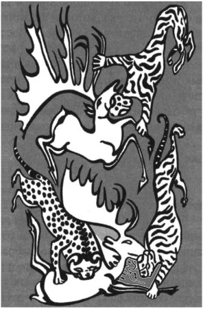 Очень интересен образ фантастического хищника с полосатым хвостом, иногда непропорционально длинным и сильно закрученным. Он сочетает черты тигра и рогатого волка, причём рога здесь — такие же, как у копытных грифонов (о них см. ниже). Системы в его размещении пока не видно, аналогий очень мало (лучшая — на большом ноинулинском ковре [4]), так что от интерпретаций, мне кажется, здесь пока следует воздержаться.