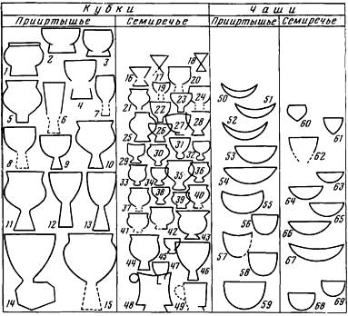 Таблица распространения выделенных типов головного убора указывает также на область возникновения тех или иных форм, которой Прииртышье обязано их появлению. Так, шапочка в виде невысокого уплощенного выступа (рис. 2, 6), прежде чем появиться на Иртыше, прошла длинный путь из Тувы и Монголии, через Хакасию и Алтай. Далее к западу подобная форма не получила распространения.