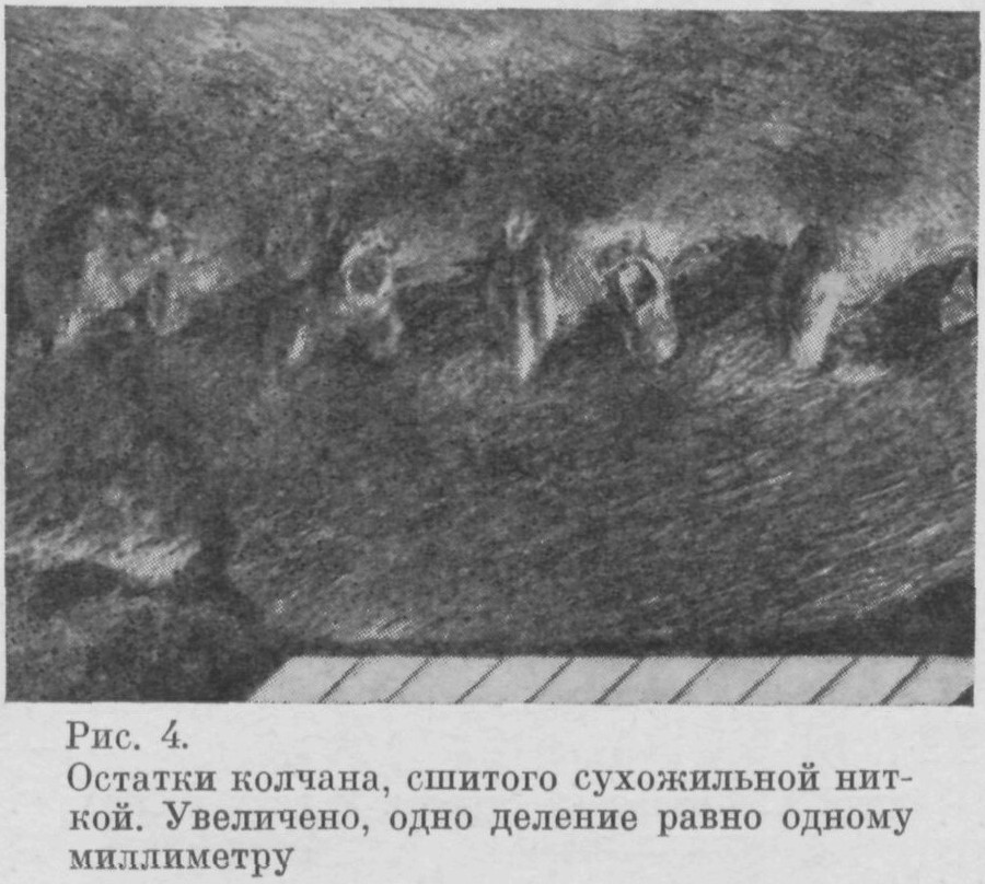 ^ Рис. 4. (с. 28) Остатки колчана, сшитого сухожильной ниткой. Увеличено, одно деление равно одному миллиметру.