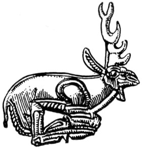 ^ Рис. 5. (с. 31) Изображение оленя на золотой обкладке рукоятки топорика из Келермесского кургана на Кубани.