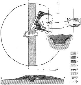 1 — могильная яма; 2 — дромос; 3 — земля, выкинутая на поверхность при рытье ямы; 4 — кольцо из крупных камней по окружности кургана; 5 — грабительский ход; 6 — раскоп.