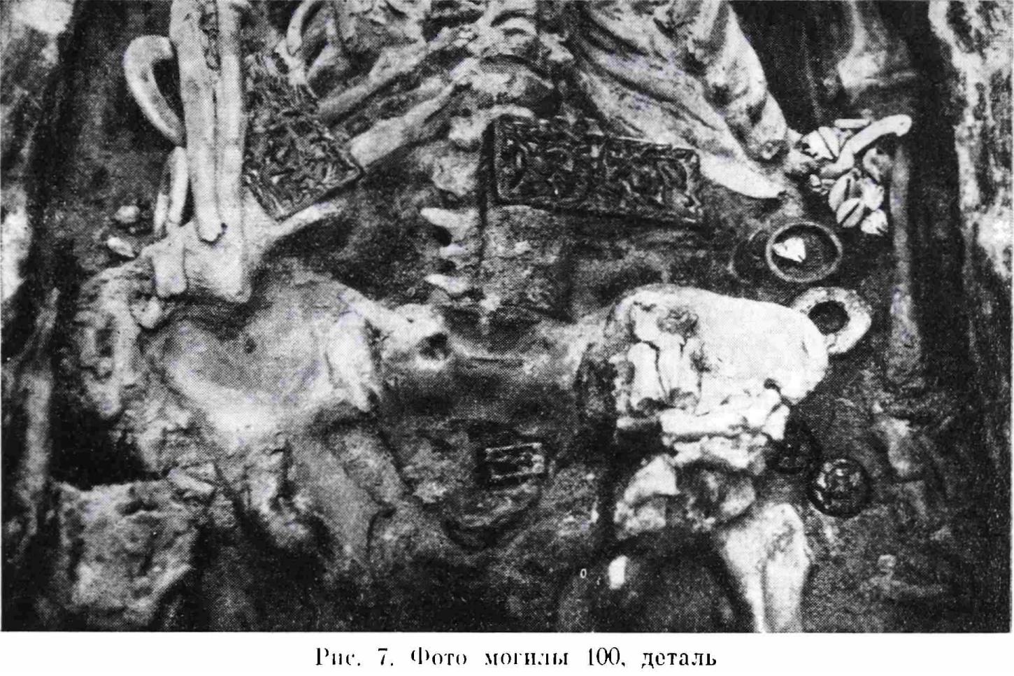 Следует отметить, что украшение пояса мелкими бронзовыми бляшками наблюдается уже в скифское время. Такие пояса, составленные из небольших бляшек с растительным орнаментом, найдены в Ордосе [6, с. 7-24] и Юго-Западной Маньчжурии [7, с. 21-27], небольшие бляшки с изображением птицы были также на поясе погребенного в мог. 1 у с. Дворцы в бассейне Верхнего Амура [8, с. 136-139].
