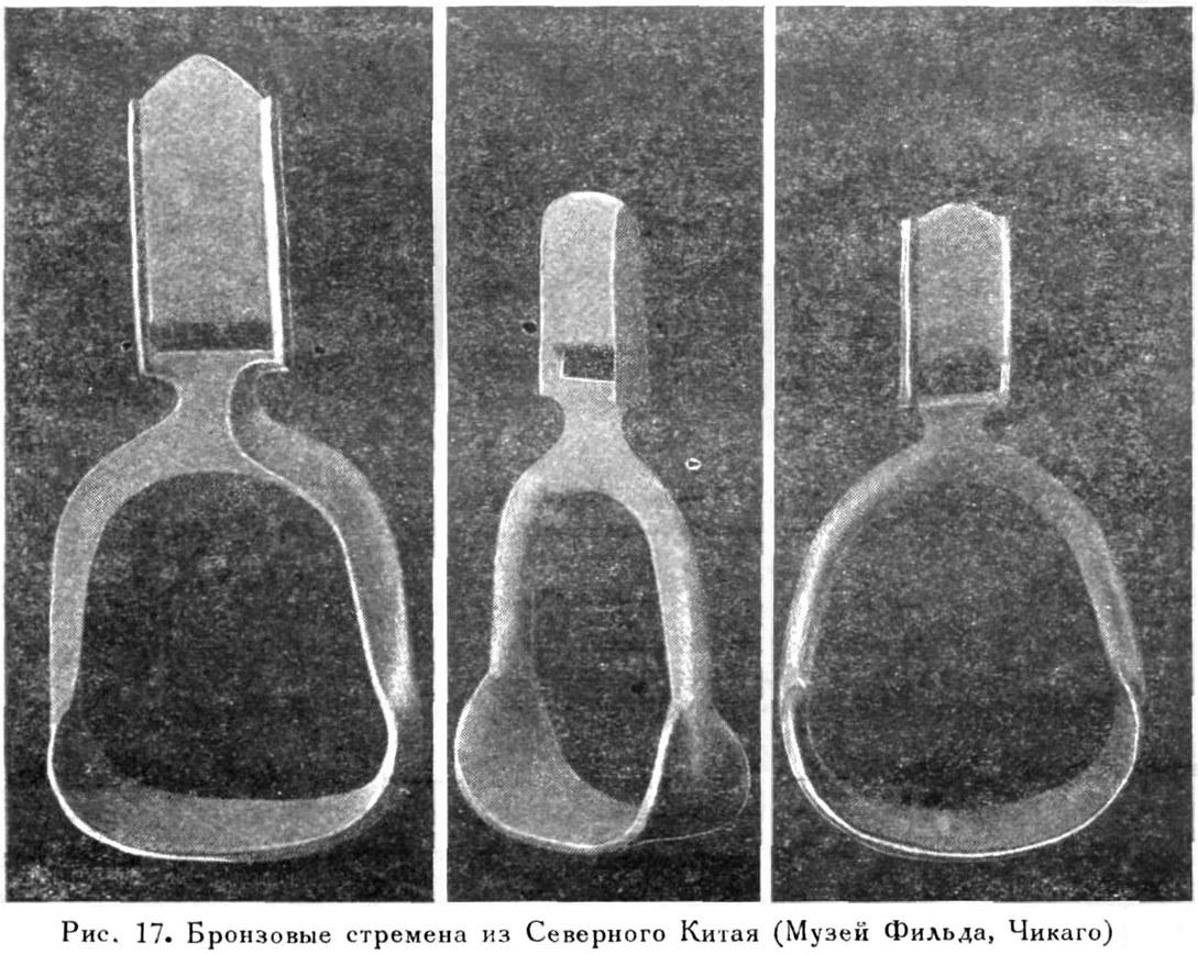 Три бронзовых гладких стремени совершенно аналогичной формы мы находим среди северокитайских бронз, хранящихся в музее Фильда в Чикаго (рис. 17). Они отнесены там к ханьскому времени, в чём издав-