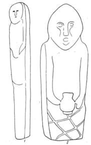 Каменные изваяния обозначают самих умерших. Об этом свидетельствует ясно обнаруживающееся стремление к передаче индивидуальных портретных черт лица — его овала, формы усов и бороды, особенностей украшений, изображенных на изваянии, различий форм сосудов в руках.
