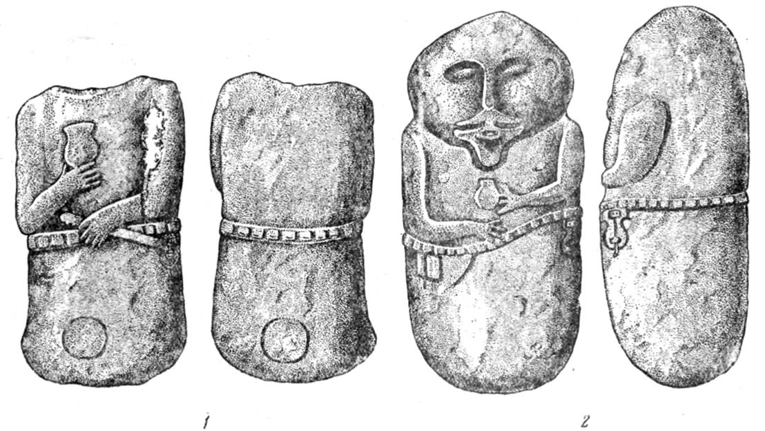 бражена в виде углубления вокруг подбородка. Правая рука держит (очевидно, за боковую ручку-петлю) на уровне груди небольшой кувшинчик с плоским дном и расширяющимся кверху горлом, левая держит рукоять сабли с треугольным навершием. На верхнем краю ножен имеются два полукруглых выступа с прикрепленными к ним ремнями от гладкого пояса, на котором висит сабля. На правом боку подвешен мешочек с орнаментом в виде несомкнутого овала с завёрнутыми внутрь концами. От мешочка вниз спускается, повидимому, мусат или нож, в виде длинного, суживающегося книзу предмета с круглой головкой. Спина изваяния не обработана. Изваяние стоит лицом на с.-з. (рис. 17, 2).