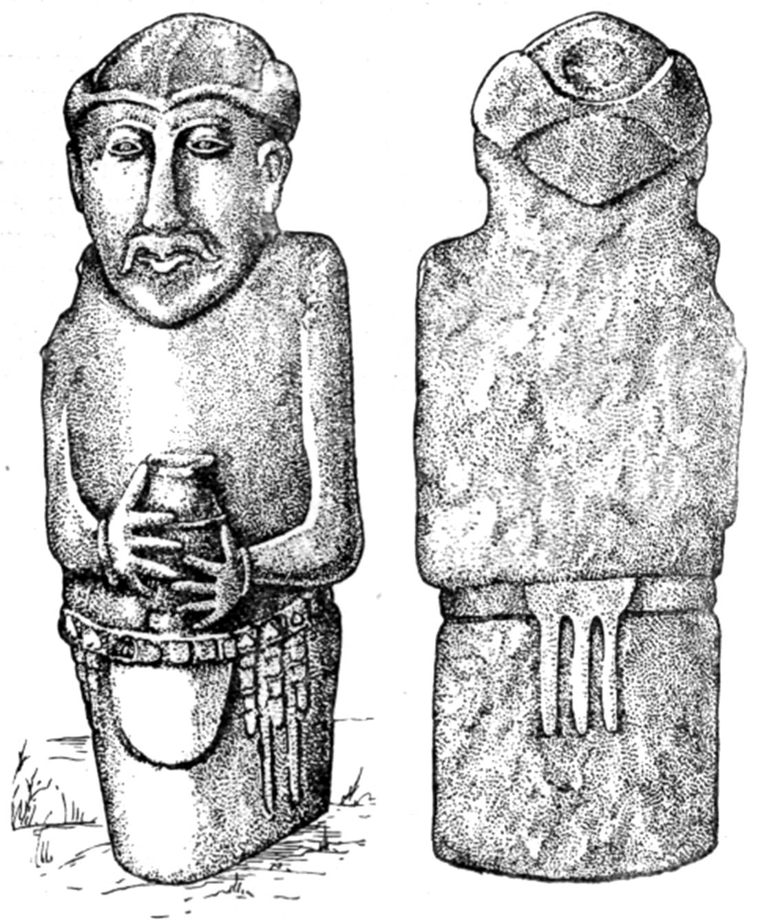 пояса спускается овальный мешочек с двумя рельефными округлыми завитками. У изваяния внизу вытесан толстый округлый шип.